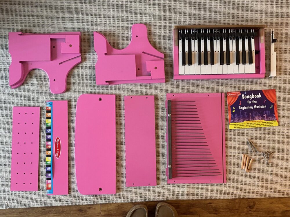 After this, I came back to Boulder and took a break from building. I decided that I wouldn’t be able to make the sound mechanism for the piano myself, so I finally accepted my fate and bought a premade toy piano from Melissa & Doug to harvest for parts. This piano was about $50 which is not necessarily expensive, but more than I wanted to spend on this project. Still, I really want this piano to function, so I think it had to be done. When the piano was delivered, I immediately took it out of the box and disassembled it as much as I could. I got to see the inner workings of the keys and realized that this piano isn’t as well-built as I expected from a company like Melissa & Doug, which made me prouder of the piano I made.