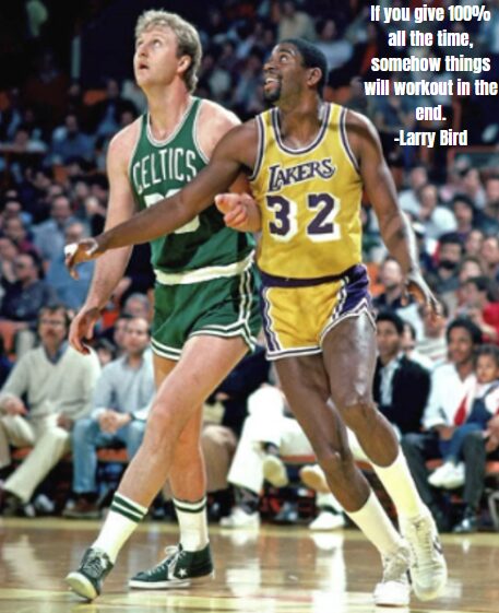 After I had the frame finished up, I focused on the picture itself. I found a great iconic sports photo taken a long time ago of Larry Bird (former Boston Celtics player) and Magic Johnson (former Los Angeles Lakers player). I am a huge Boston Celtics fan, so I wanted to find a picture that had something that included my favorite team. After that, I added one of Larry Bird’s most famous quotes, which is “If you give 100% all the time, somehow things will work out in the end”. The picture that I will be using can be seen below, in image (3) by Etsy.