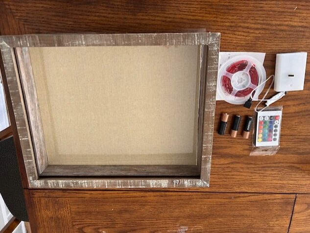 The first major milestone I reached was ordering all of the necessary materials. I sourced a pre-made LED kit that includes color and brightness adjustability that is easy to use with the remote. The other materials ordered were a rustic wooden frame, a battery pack, and the necessary adhesives. I also gathered some materials that I found at my house, which were Styrofoam and felt. This was used for the interior backing, which creates a layered, textured background that complements the vintage sports aesthetic. This stage was easy, but a little time-consuming because I wanted to find the cheapest prices to stay within my budget as well as find the pieces that would emphasize what my aesthetic is. Most of the materials can be found in image (2) below.