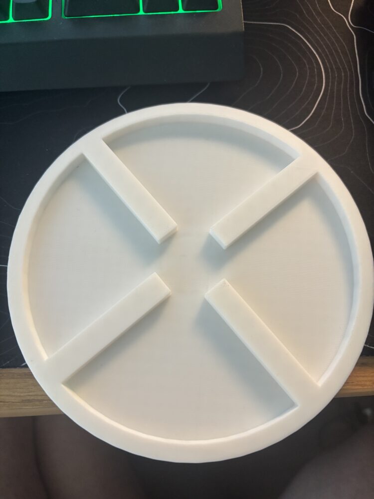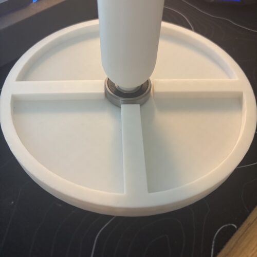 My first constraint is counter space. I need this piece to easily fit onto a counter, which is why I designed it so that it is not too large. I am planning on the plates to be 10 inches in diameter, with the base being 6 inches in diameter. Another constraint I have is money. As a college student, I am pretty broke, and through this design process have tried to pick materials that are relatively cheap. I was able to get bearing online at a reasonable price point and have 3D printed components for the piece which came at a very minimal cost. My third constraint is the precision of 3D prints. I designed my base to have an area the same size as my bearing, but when I received the finished piece, I found that the area was to big for the bearing to press in. Because of this, I will have to use glue to fasten in the bearing to the base, as well as to get the center support rod to fit into the center of the bearing. My final constraint so far has been time. This post is being made late as I have been incredibly busy the past 2 weeks, both with some personal issues, as well as senior project issues which have required me to spend a large amount of time working on that as we approach expo. I have gotten through the worst of those issues, and now will have more time to dedicate to this project, and am feeling way less burned out.