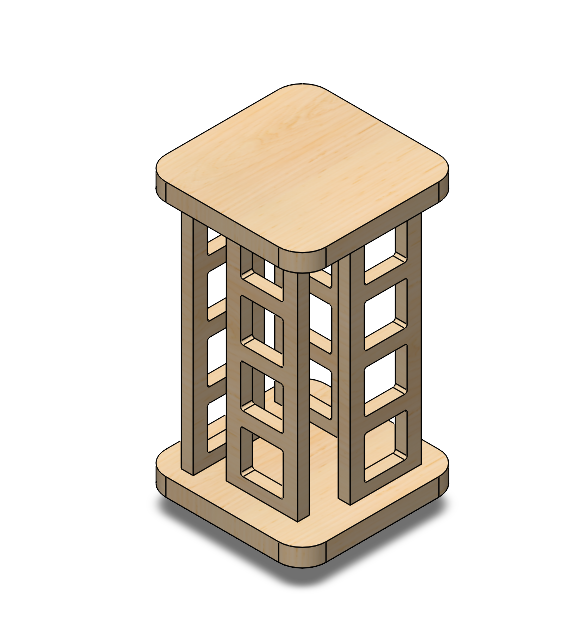 Even though I did not do any hand sketches, my CAD model showed the full design and helped me figure out the right proportions and spacing. The spinner has a round base and a round top piece. There are four panels that hold the jars. Each panel holds three jars, and the jars fit into holes that I cut into the wood. I made sure the jars fit tightly so they would not wobble when the spinner turns. The lazy Susan bearing is attached to the bottom piece, which lets the whole spinner rotate smoothly.