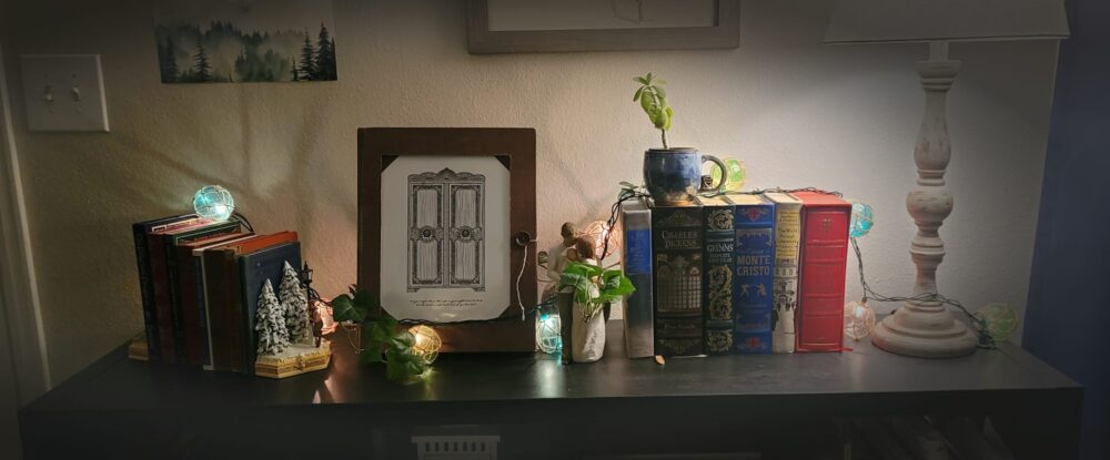 The Bookframe is an atlas turned picture frame housing an art piece and made specifically to blend into the aesthetic of our home’s vintage style bookshelf.