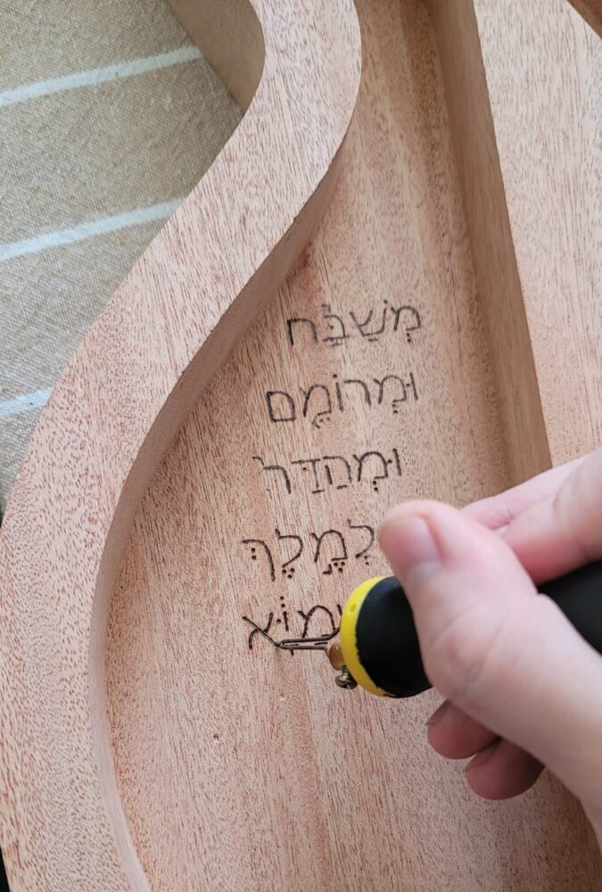 The sound hole’s inscription is in ancient Hebrew and reads in English, “praise and extol and honor the King of Heaven,” taken from the Bible’s Daniel 4:37. From these words is derived the name I chose for the guitar: Extol.