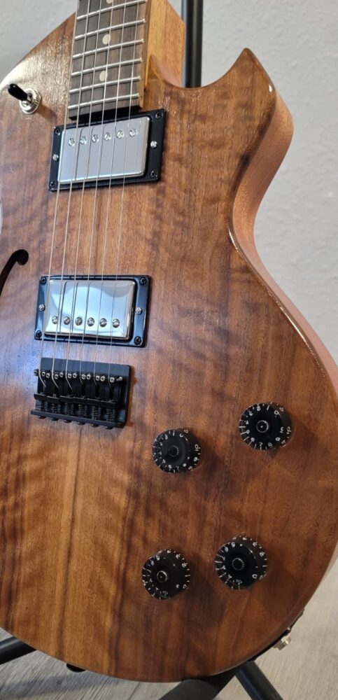 My guitar is a semi-hollow body design of flamed black walnut set atop a hollowed back of African mahogany. The rounded lower bout of the body shape design honors the sound-driven shape of acoustic guitars. The upper bout meets the neck at an apex on the left side, and the right side cutaway is accented with a flat-edged horn unique to this guitar. It also features a single f-shaped sound hole reminiscent of those used on string instruments for centuries. The dark tones of the wood and oil finish make the guitar feel “warm” as its sound resonates likewise.