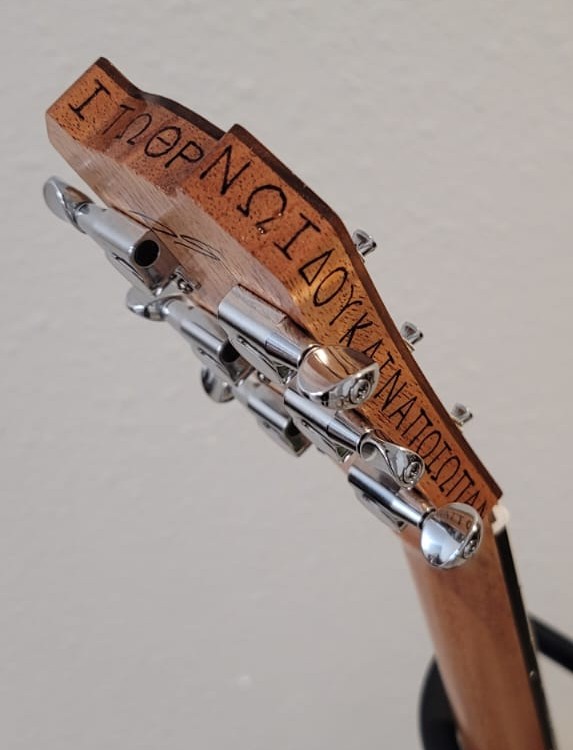 Ancient Greek surrounds the headstock and reads, “And he who was seated on the throne said, ‘Behold, I am making all things new.'” (Revelation 21:5). The former is thematic of the instrument and player’s purpose for creation, and the latter is a hopeful forward-looking to Jesus’ return at the end of the age.