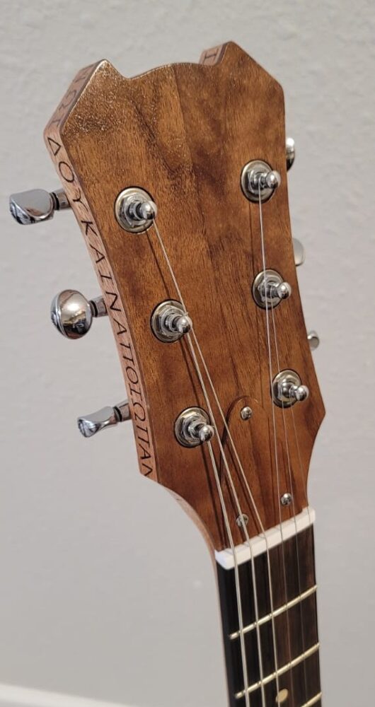 The neck is also made of mahogany with a walnut headstock veneer and ebony fretboard. The headstock design is my own, and its symmetric “horns” incorporate the same lines of the body’s cutaway horn.