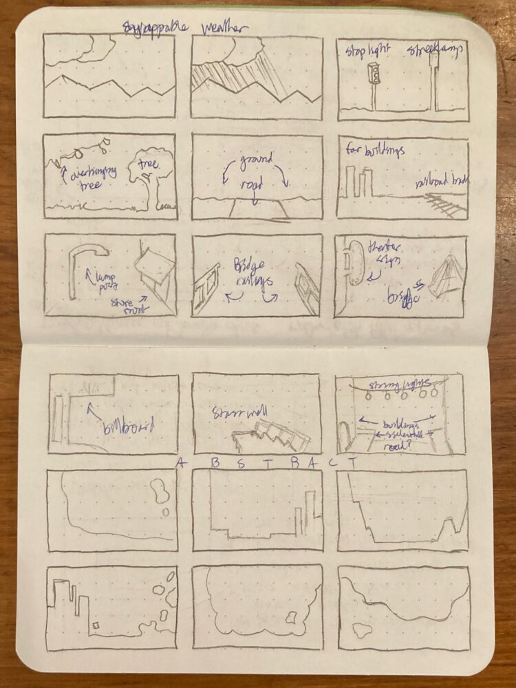 In search of imagery to put onto the fourth pane and refine the current selection, I performed the above ideation sketches. I took inspiration from my original photographs, current scenes, and some ideas from my peers in class. I also remembered that abstract shapes were part of my original impetus for pursuing acrylic etched silhouettes, and thus dedicated six of the thumbnail sketches on the bottom to abstract shapes.