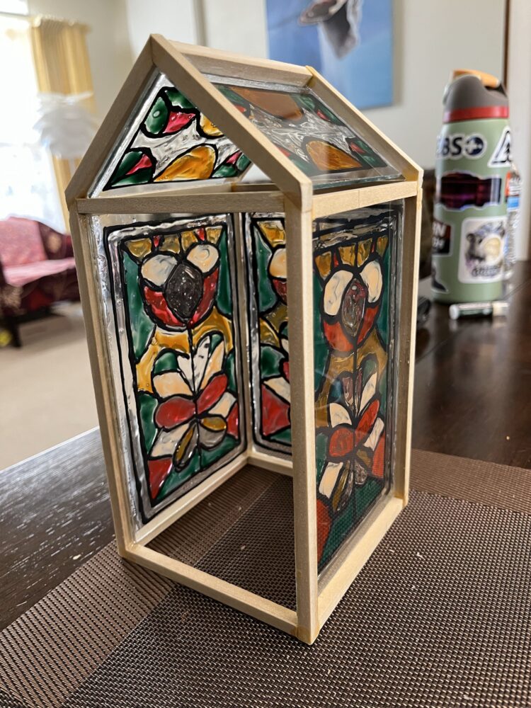- After assembling the glass to the structure, I used stained glass paint to make a cool design to the terrarium.