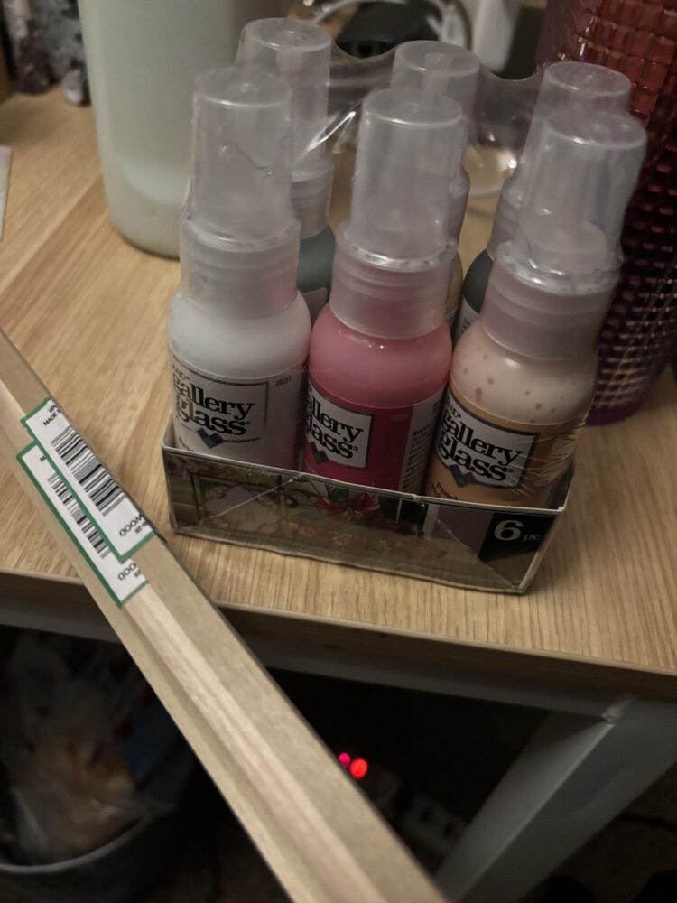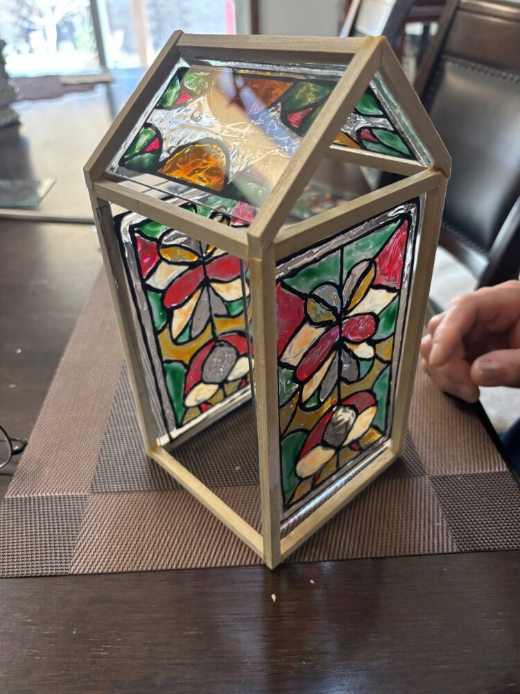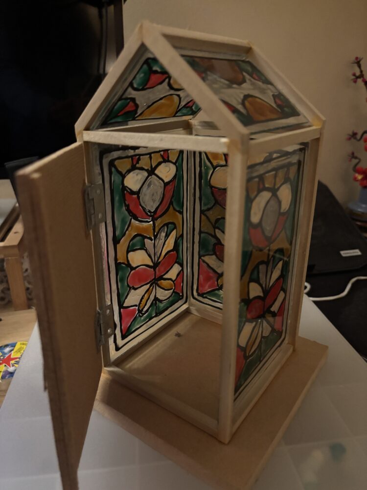 After measuring and understanding the frame and sizing of my project, I went to the wood shop to cut up the wood pieces into the right sizes. I then went to McGuckin’s and cut up the glass to the sizing of the structure. At first, I planned to find glass pieces to build my frame around it, but I decided it would be easier to plan out my design for more flexibility. I used glass paint to paint designs on the glass. I freehanded the pattern, Figure 4 shows how it looks wet.
