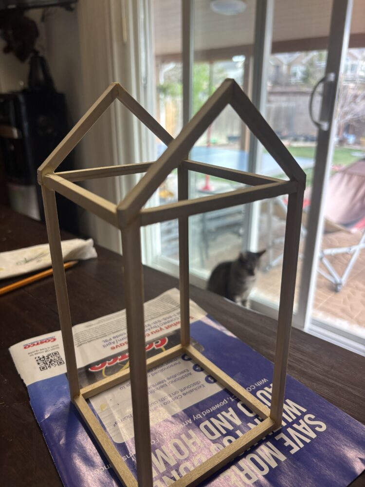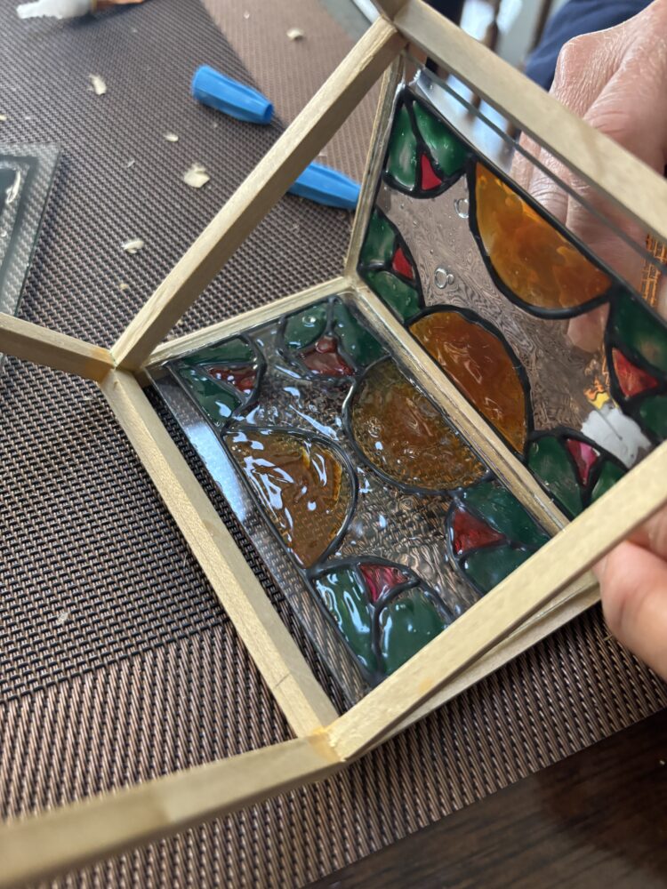 After attaching the wood pieces with wood glue, the structure was looking pretty solid. I then fit the glass pieces into the frames, some parts of it like Figure 8 had a few gaps because of how the wood fit together. I am not very satisfied with it, but it is a terrarium so there is room for space because air should be able to enter the model.