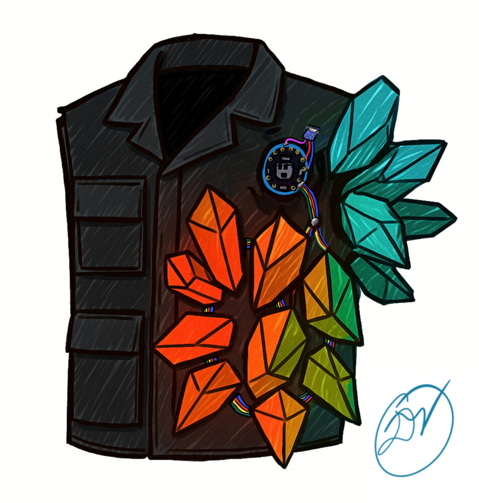The project began with a core idea: a reactive vest that feels alive and changes color based on movement. I envisioned a cyberpunk exoskeleton that would shimmer when calm and flash when energized. Early concepts explored a sharp, crystal-laden vest, with lighting behaviors drawn from both natural bioluminescence and digital glitch art.