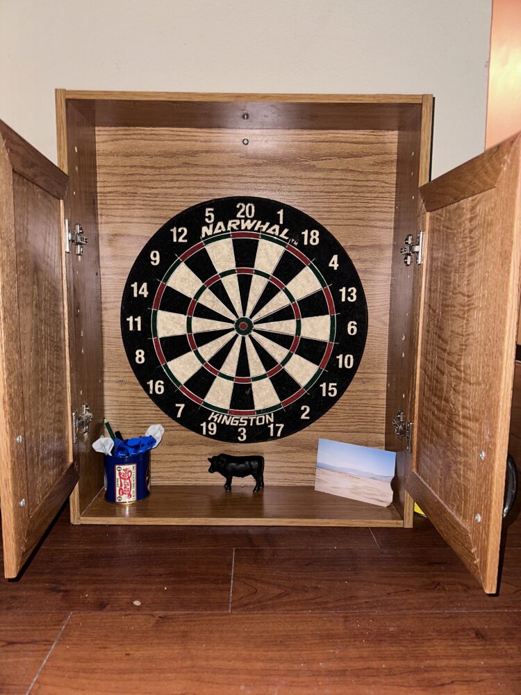 For my upcycling project, I designed and built a Western saloon-style cabinet dartboard using a reclaimed cabinet from Resource Central and a mix of thrifted materials. The idea stemmed from wanting something useful and entertaining for my house, and the aesthetic direction clicked after thinking about Western bars with pool tables and dartboards. I stained the cabinet a dark “Early American” tone to match the rustic saloon vibe, added Western trinkets like a toy bull and mini gas lantern, and mounted the dartboard inside. While I faced challenges—like door alignment and hardware issues—I embraced the imperfections, which ended up adding to the old-time feel. I’m especially proud of how cohesive the aesthetic is, and the result is something both functional and full of character. This is a piece I’ll use and move with for years, and I love being able to tell people I built it myself.