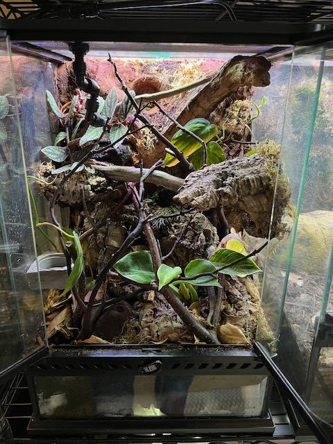 My vision for this project drew upon my aesthetic, and emphasizes my love for nature and wildlife. I have kept reptiles for many years, and my favorite part about keeping them has been designing and creating their terrariums- they are truly tiny slices of nature. I created a planted terrarium with a self-sustaining ecosystem intended for two chameleon geckos (Eurydactylodes Agricolae). These terrariums, called bioactive terrariums, at their foundation consist of a substrate mix, live plants, insects such as springtails and isopods, and the inhabitant of the terrarium. The insects, colloquially known as the CUC (“clean-up crew”), eat dead leaves and most notably the inhabitant’s waste to “clean” the enclosure. This creates a self sustaining environment that needs little to no cleaning.