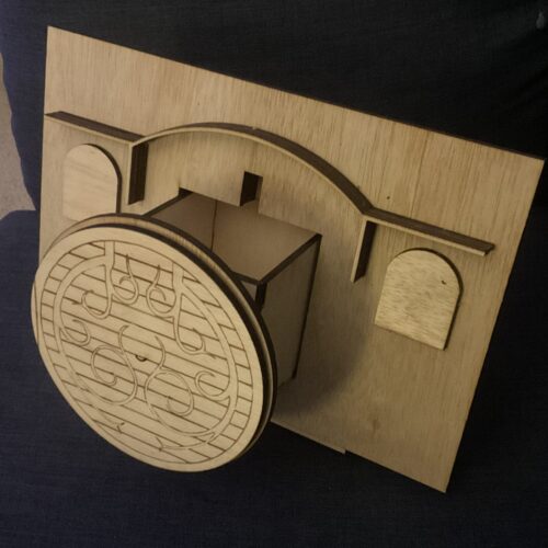 The fabrication phase took place between March 31st and April 14th. I laser cut layers of wood to construct the round hobbit door and faceplate. Each wooden ring was stacked and glued to create a textured, dimensional look. The internal storage box was cut from acrylic and I used adhesive to form the cube. I integrated the locking slot into the woodwork behind the doorknob and designed a matching key to align with hidden pegs that secured the compartment shut. The full frame (about 12″x8″) was constructed from wood and finished with sanding, dark stain, and faux greenery.