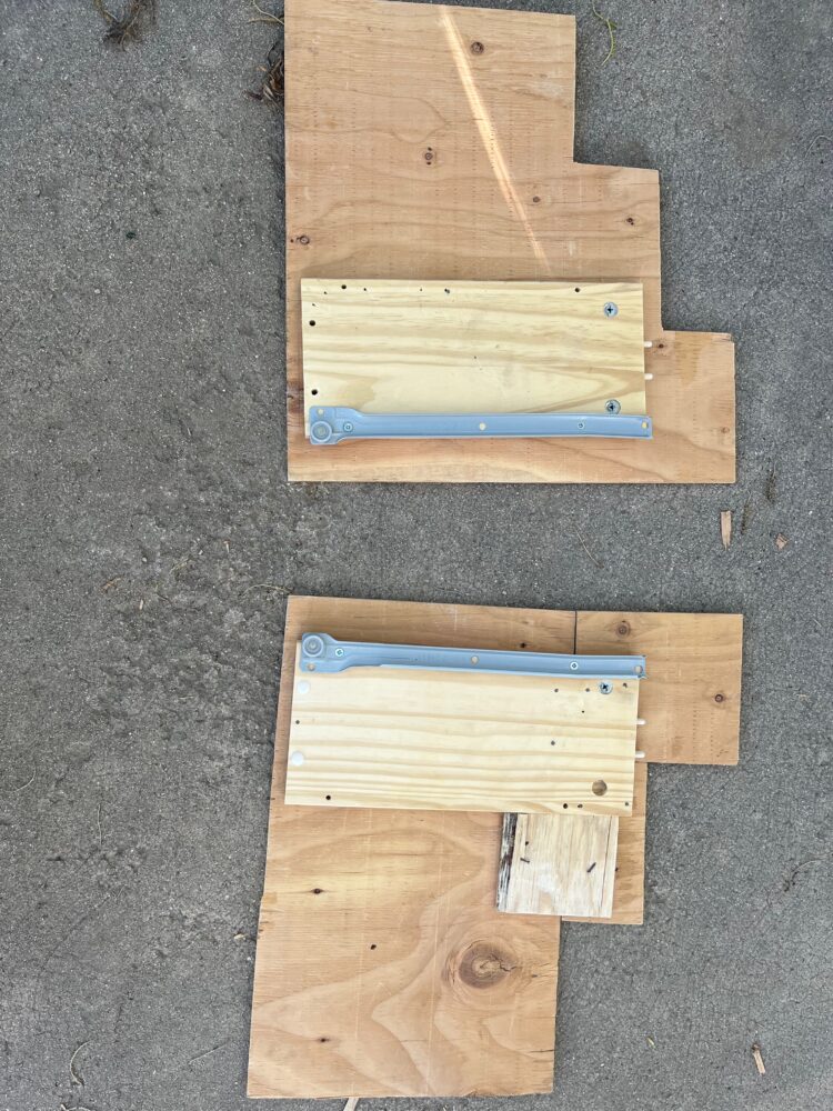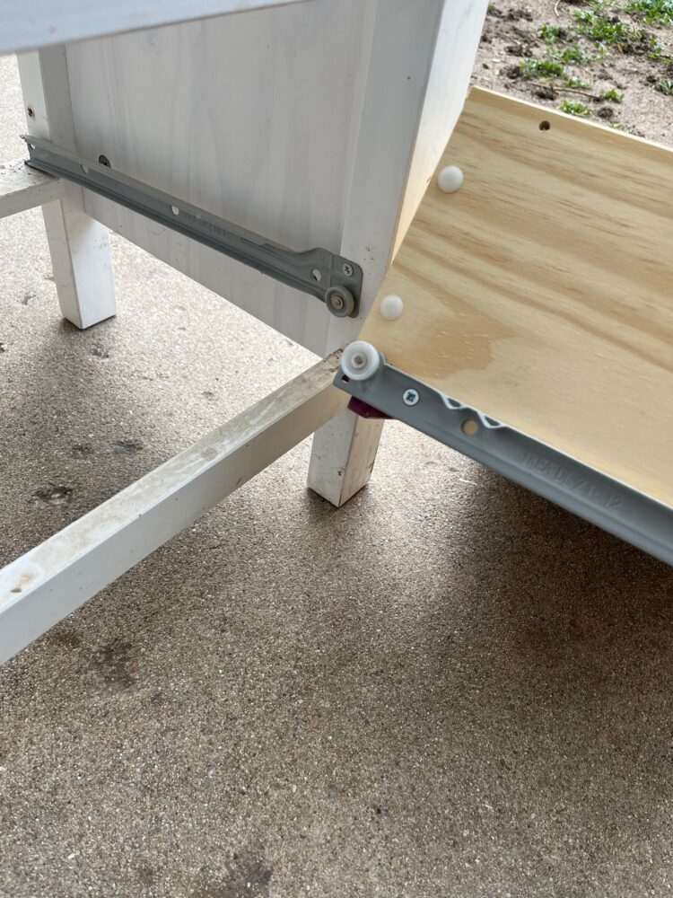 I started disassembling the drawers by taking them off their rails and unscrewing the rails from the table. With the drawers removed I realized that the rails had very specific mounting screws that bore into slots in the wood in the table. Since the wood I purchased didn’t have those slots, I knew that sinking the screws would be extremely difficult. So I decided to take the drawer without a knob and disassemble it even further by taking each board apart from each other. Once I had done that, I was then able to attach the rails that were originally on the sides of the table to the sides of the drawer using the same guiding holes. Then I took the drawer sides and attached them to the staircase shaped side pieces I had cut out using nails I had purchased from Home Depot. With that, the drawer could slide smoothly between the two side pieces, and a major piece of functionality had been taken care of. I was also able to glue the two pieces I had previously cut out to the drawer sides, making the side pieces one whole piece again.