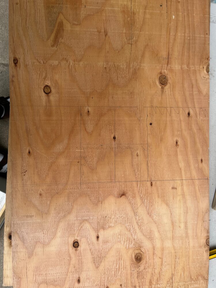 Below are the drawings I created to show the scale between the top board and the two other boards. I planned on cutting the saw pattern out of one board, and using the two resulting pieces as the sides of the stand. With the second board, I planned on cutting out strips of wood to use as the sides and tops of the staircase. You can see in the image above the result of cutting the staircase pattern out of the first board. While I planned on laser cutting the wood for precise tolerancing, the wood I had purchased was too thick and too old to be safely cut with the laser cutter, so I hand sawed out each board. Since I had to use a saw, I had to cut out the staircase pattern through one of the sides, but I was able to cut out the pieces that would’ve made up the pattern on the other board (also seen above) and I planned on fastening these pieces together with glue later in the process.