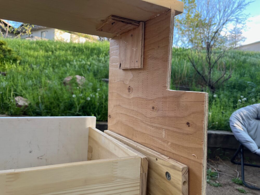 Finally, I had cut out each piece and sanded down the edges not only to make sure they were smooth enough, but also to shave down any dimensional errors I might have made when cutting with the hand saw. I had originally planned on gluing each piece together to create one solid and sturdy box, but since the pieces were relatively thin compared to their length, the glue wasn’t strong enough to prevent wobbling. Thats when I pivoted to simply using nails to join the different boards together, which was much more effective. However, the top butcher block was too thick for the thin nails I purchased to penetrate, so I designed a method of nailing to small pieces of scrap wood together at a 90 degree angle, and then nailing that assembly to the inside corner of the display stand. Below are two images that show a close up of the inside of the stand, focussed on the joining assemblies. While these assemblies look pretty rough, I didn’t mind too much since the inside will rarely be seen.