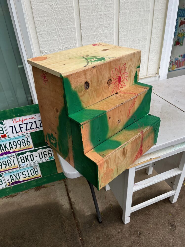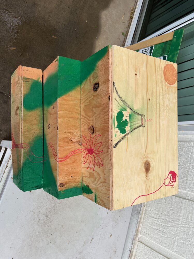 Overall, the decorations were messy, rough, and spray paint certainly won’t be my first choice to decorate something this small anytime soon, but I still like how they turned out and I’m glad I did it since it adds a lot of extra charm and character to the final design. If I had to go back and start this project all over I wouldn’t change too much. It turned out well and was cost efficient, and I’m excited to use it to display things in my room. The one thing that I wish I could go back and fix is the side panel that I had to cut through to create the stair case pattern. Using a different board for both sides would’ve worked a lot better and turned out slightly cleaner, but I’m still happy with how I did in the end. As for future plans for this project, I definitely want to revisit the decorations and maybe add some more detail with different shades of green and brown, and add more flowers with different colors since I was limited with only red. I think more complexity will add a lot of visual interest, so hopefully it turns out well.