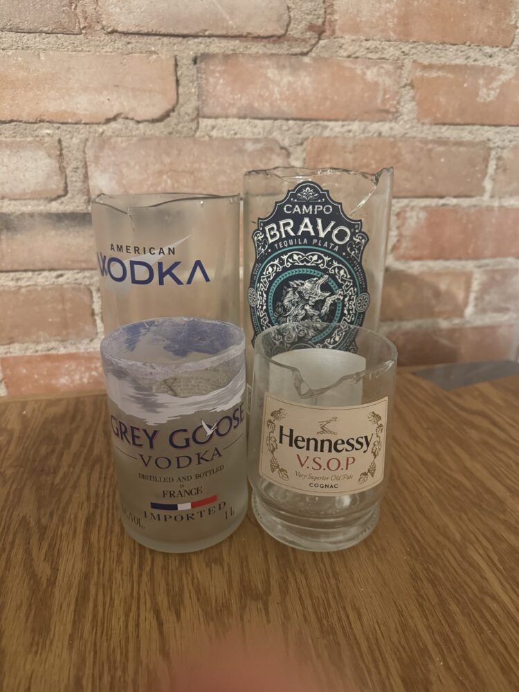 My upcycle project involved cutting and repurposing discarded liquor bottles into usable cups and vases. I chose an industrial vintage aesthetic that aligned with the raw texture and imperfections of the material. One challenge I faced was getting clean, consistent cuts without access to professional-grade glass tools. After multiple failed attempts, I found a successful workflow involving a scoring jig, boiling water, and cold-shock separation. Sanding the edges for safety and aesthetics was labor-intensive, but ultimately rewarding. I was proud of the finished product and how it retained a sense of the original material while serving a new purpose.