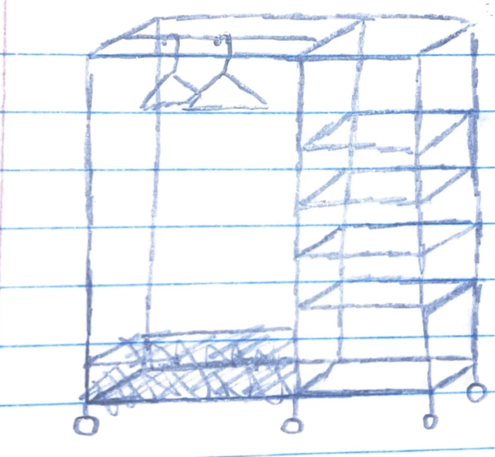 With an aesthetic direction in mind, I turned to paper. Sketching was my way of problem-solving visually. I made several iterations, playing with the placement of hanging rods, the inclusion of shelves, and the possibility of adding caster wheels for mobility. My sketches helped me figure out proportions based on my room’s layout, a roughly 5-foot-wide, 2-foot-deep space.
