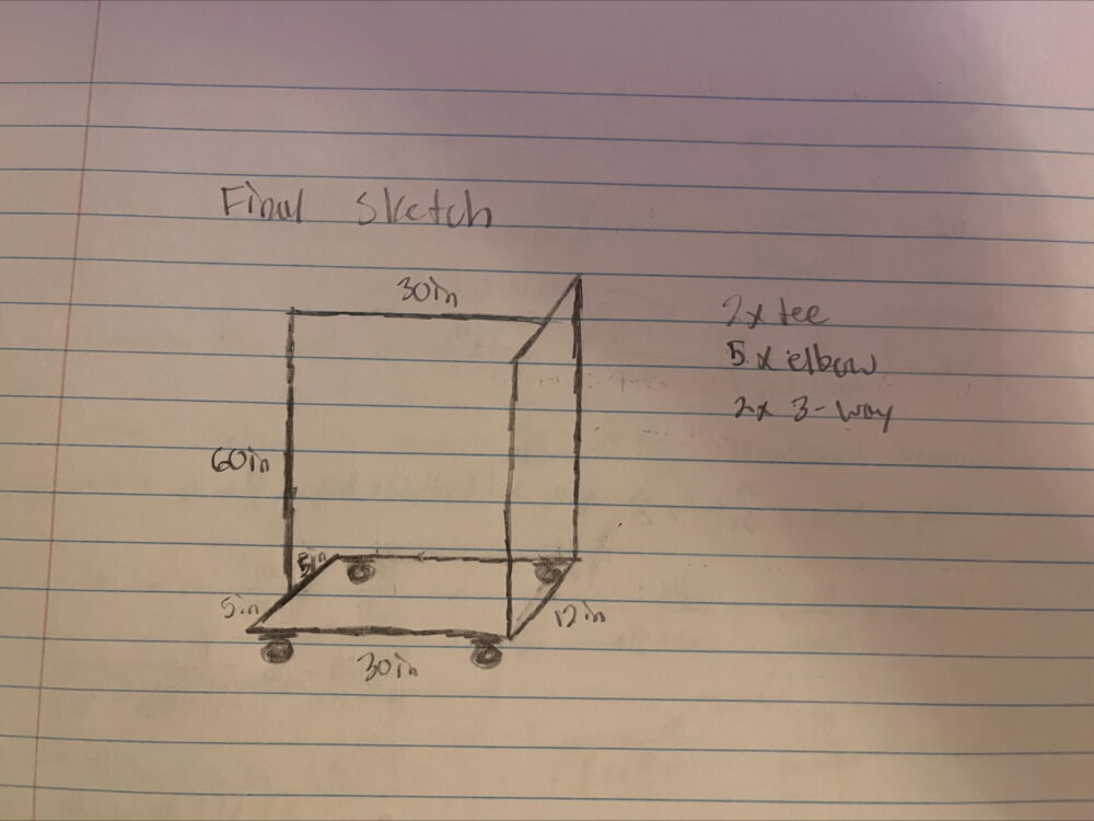At this stage, I also made a rough parts list. I broke down the project into components: pipes, joints, wooden boards, wheels, and tools. I knew I had to stay under a $150 budget, which immediately influenced the kind of materials I could consider. I also started thinking about how modular the piece could be. I wanted the flexibility to move or even reconfigure it in the future, especially if I ended up taking it to a new space.