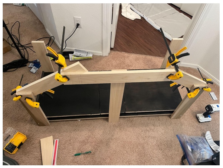 For the angled cuts I need to make for the frame, I clamped together the pieces in a way that resembled how I wanted the final product to look and marked where I needed to cut with a pencil. I chose to do this instead of planning out exact measurements because I believed it to be the faster method; however, this does make it a lot harder to replicate to the exact same spec.