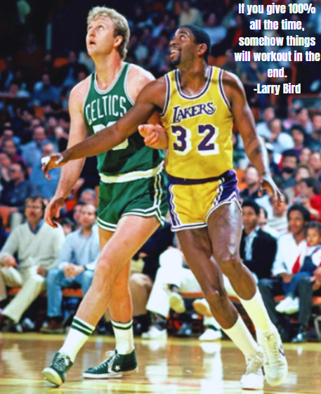 - Selected an old vintage sports photograph taken of Larry Bird and Magic Johnson, two NBA legends. This image can be seen above in image [3].
