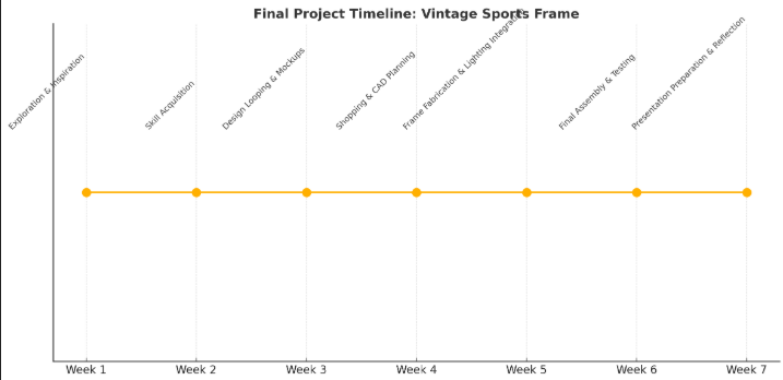 To complete my vintage sports-themed framed picture with integrated LED backlighting, I went through several phases, including research, skill development, material acquisition, design iteration, and fabrication. The following timeline breaks down the key stages, which can also be seen below in image [2]: