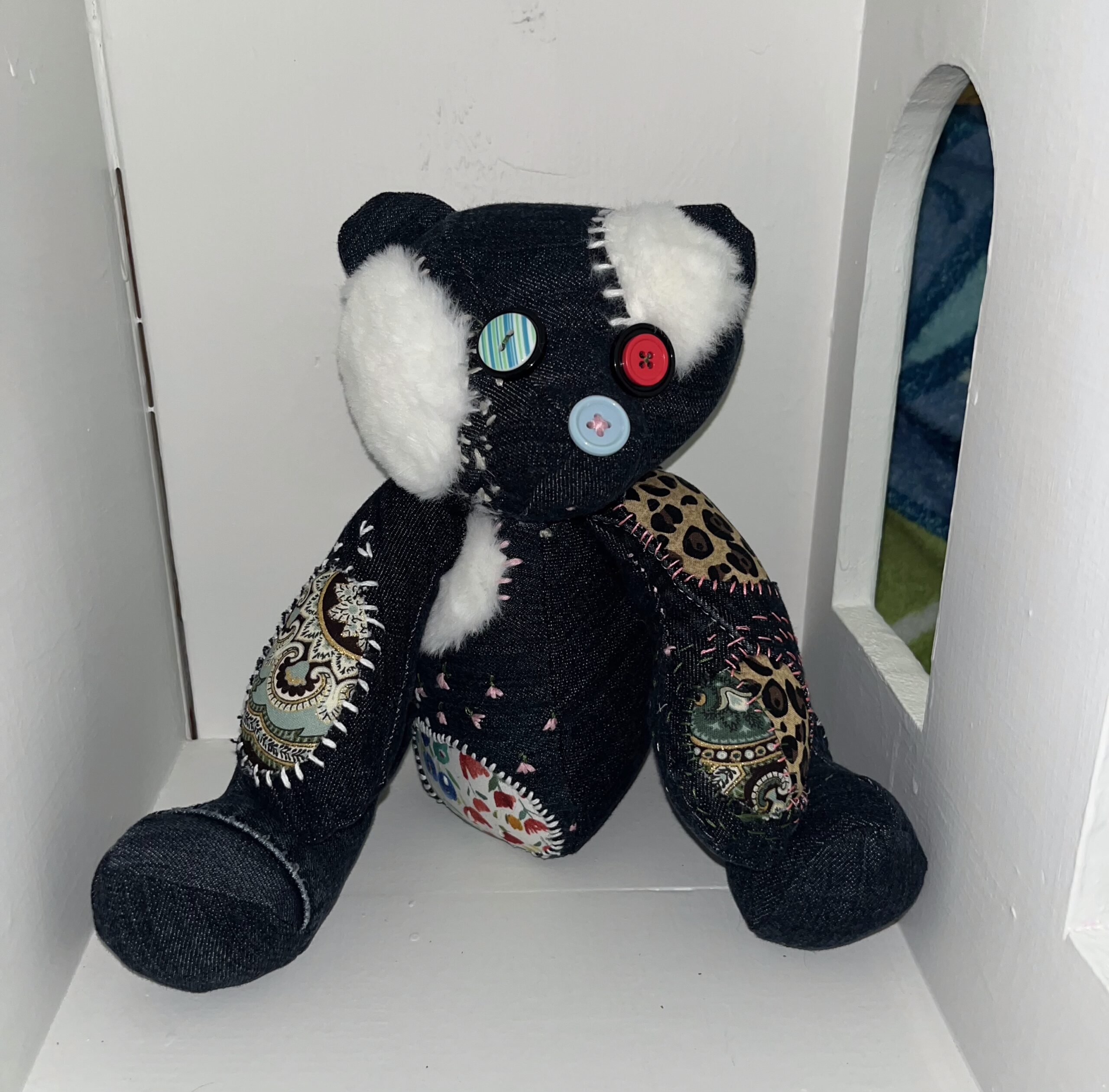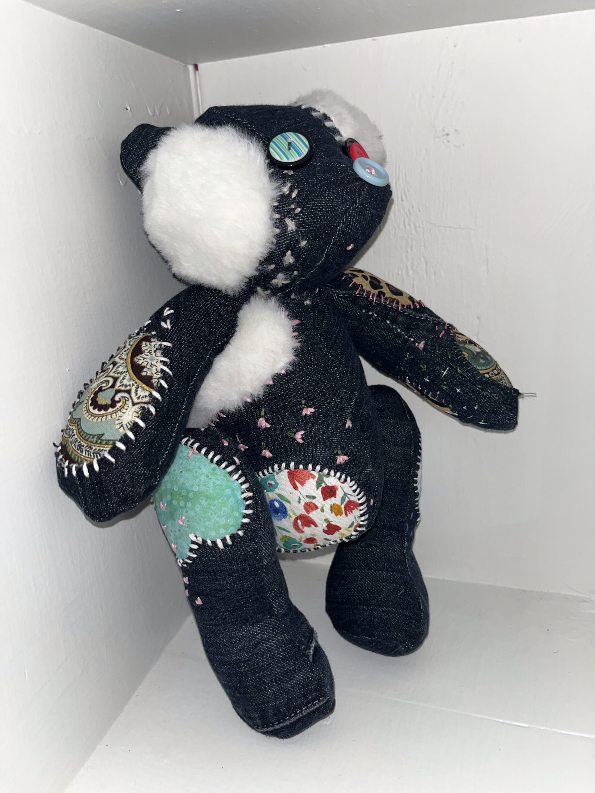 This class was very interesting; the way it was taught was very similar to my regular art/studio classes. To start off, my upcycle design project was very nice because it allowed me to experiment with embroidery and patchwork, and having to choose a specific aesthetic for the design to be based on was honestly one of the best parts. I love making stuffed animals and toys, so I knew I would make a bear for that project, but the overall result was perfect. The denim looked great with the cotton fabrics, and the small and thick embroidery really highlighted the sashiko and patchwork aesthetic. But the different patterns also highlighted the maximalist feeling that I wanted to clash with such a traditional form of patchwork. This project also made me want to keep making a series of bears based on the same pattern since this used the same pattern as a bear I made in the past.
