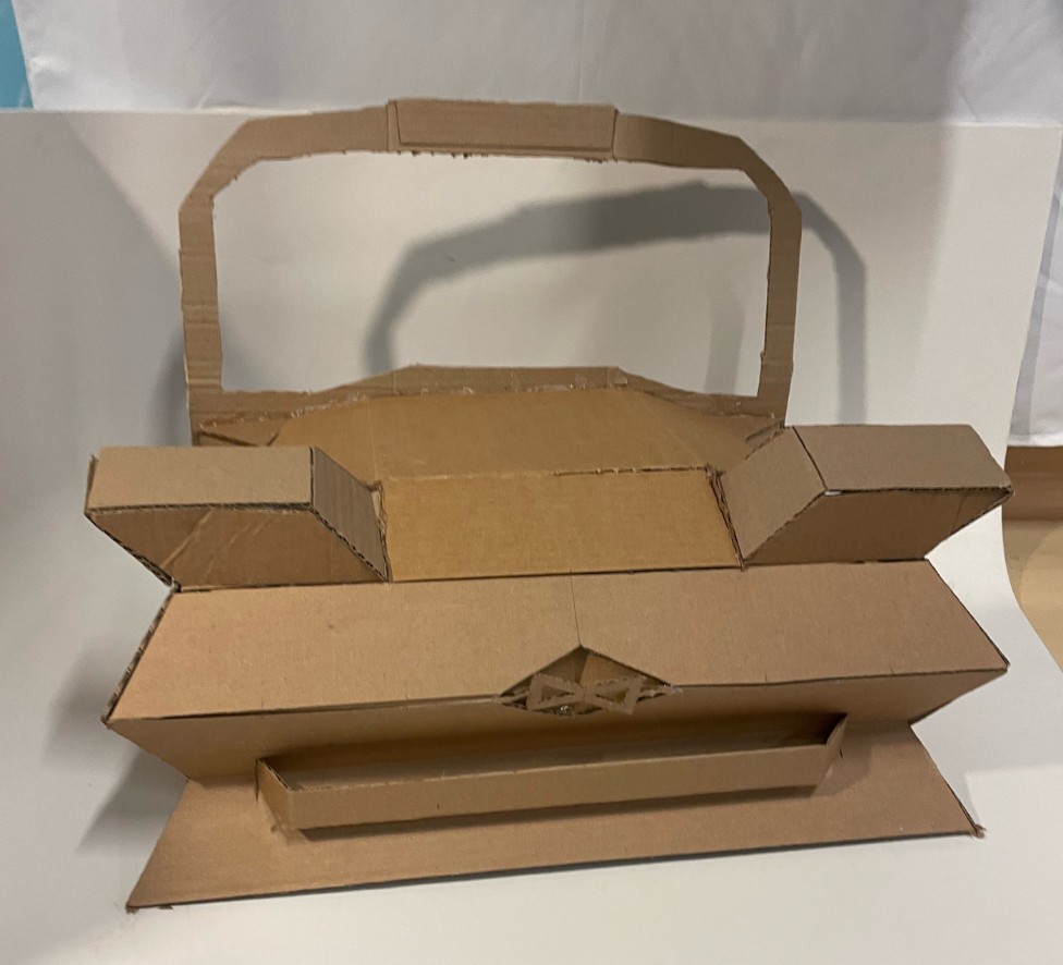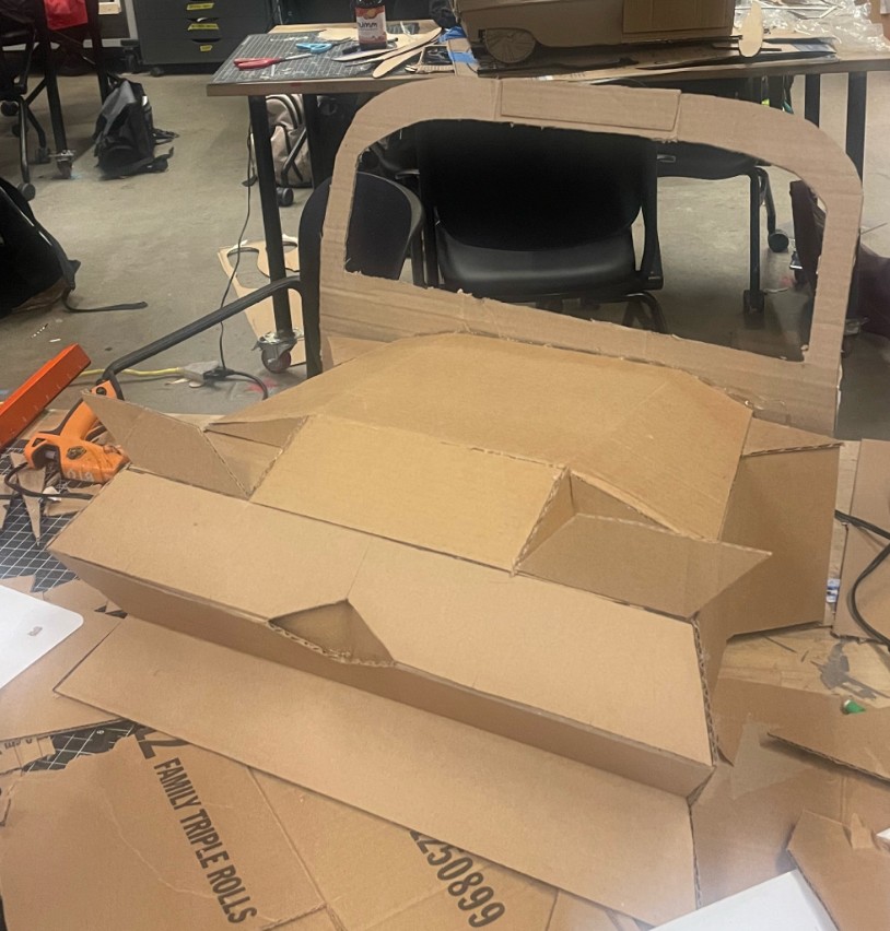 We primarily used cardboard for the build, assembling the structure with hot glue. Alongside the physical model, we also created a 3D version in Onshape to better visualize the design in three dimensions. As the project progressed, we refined the form by adding more defined angles, reinforcing the structure, and incorporating key features like the windshield.