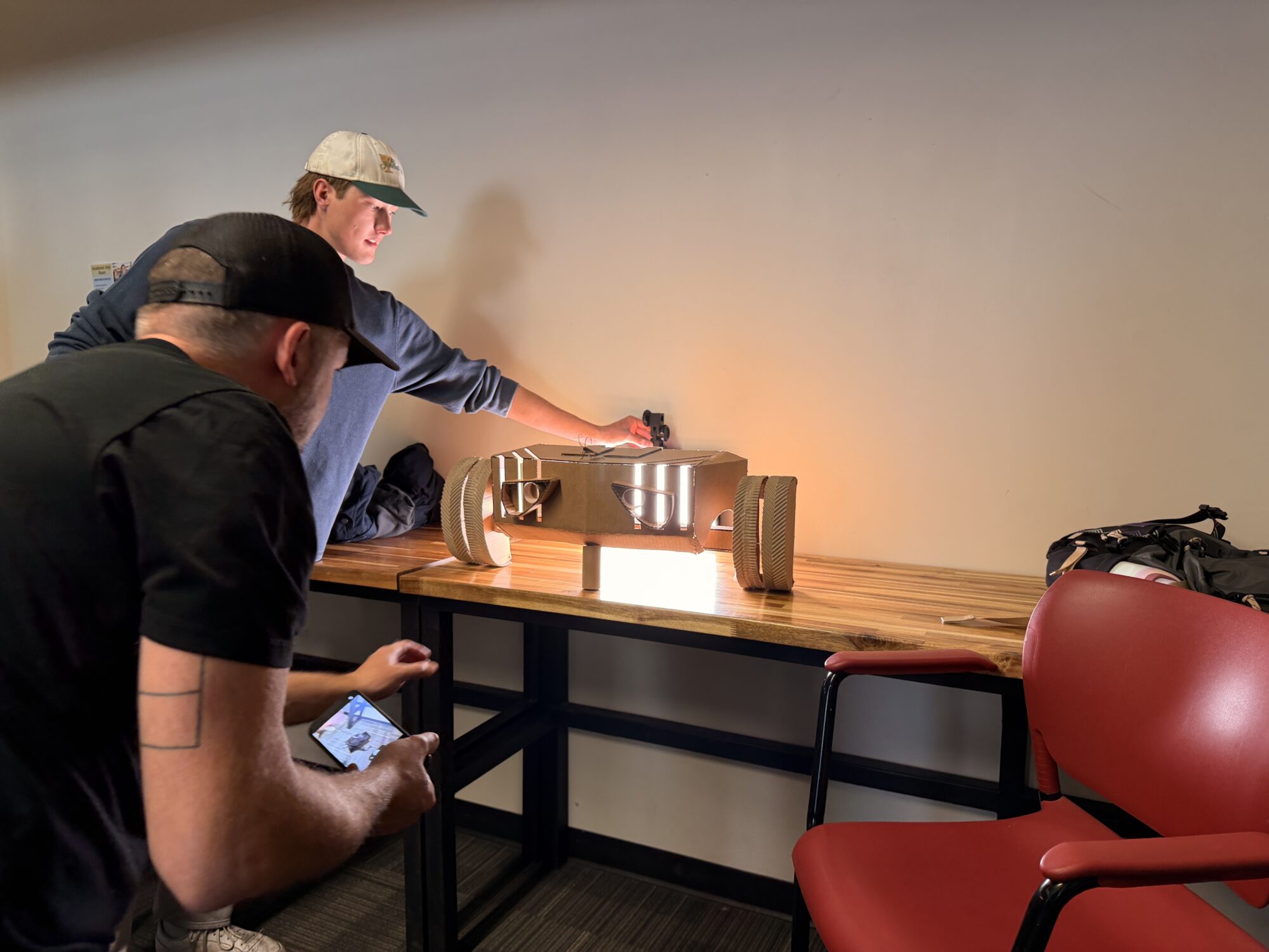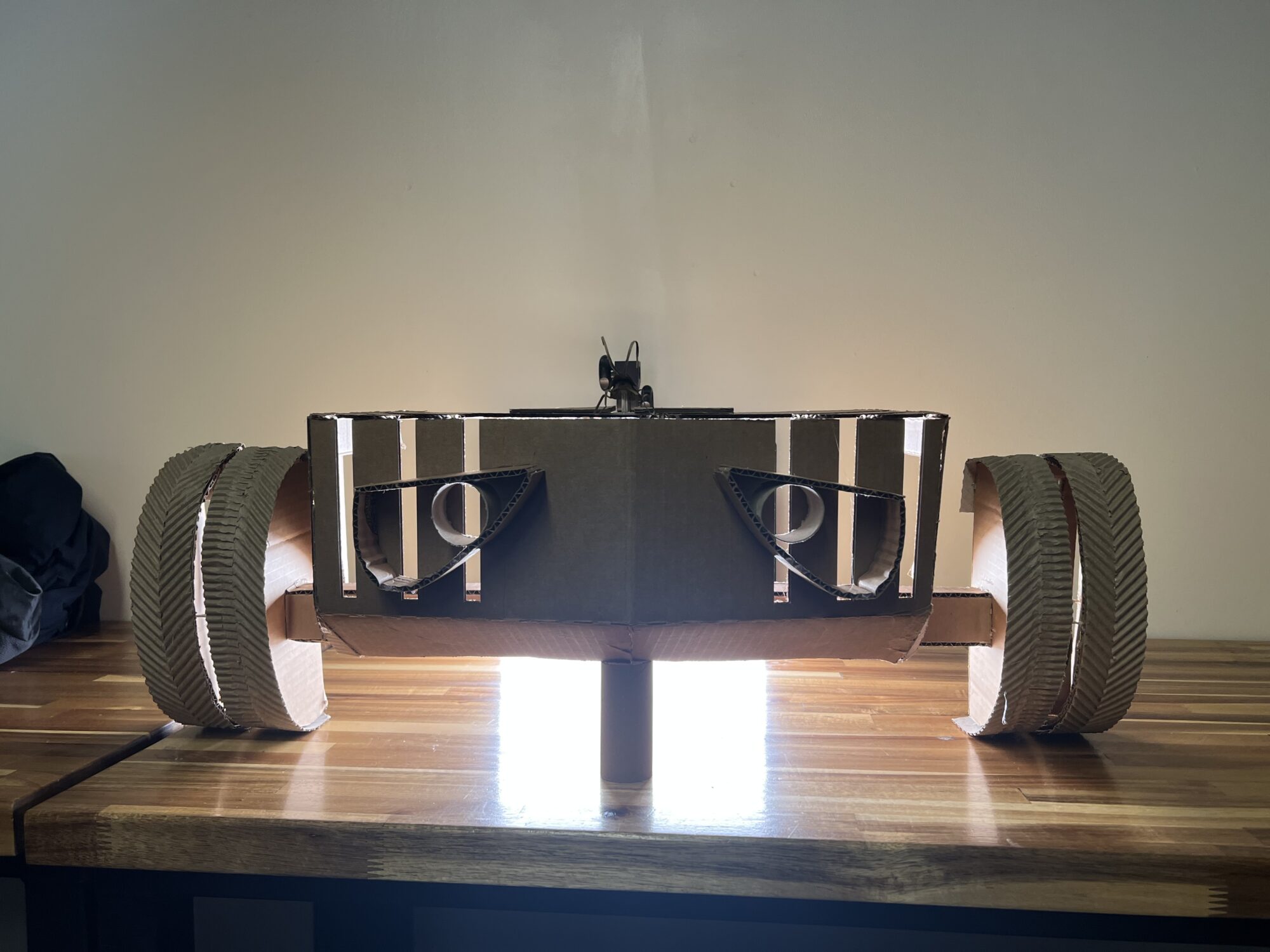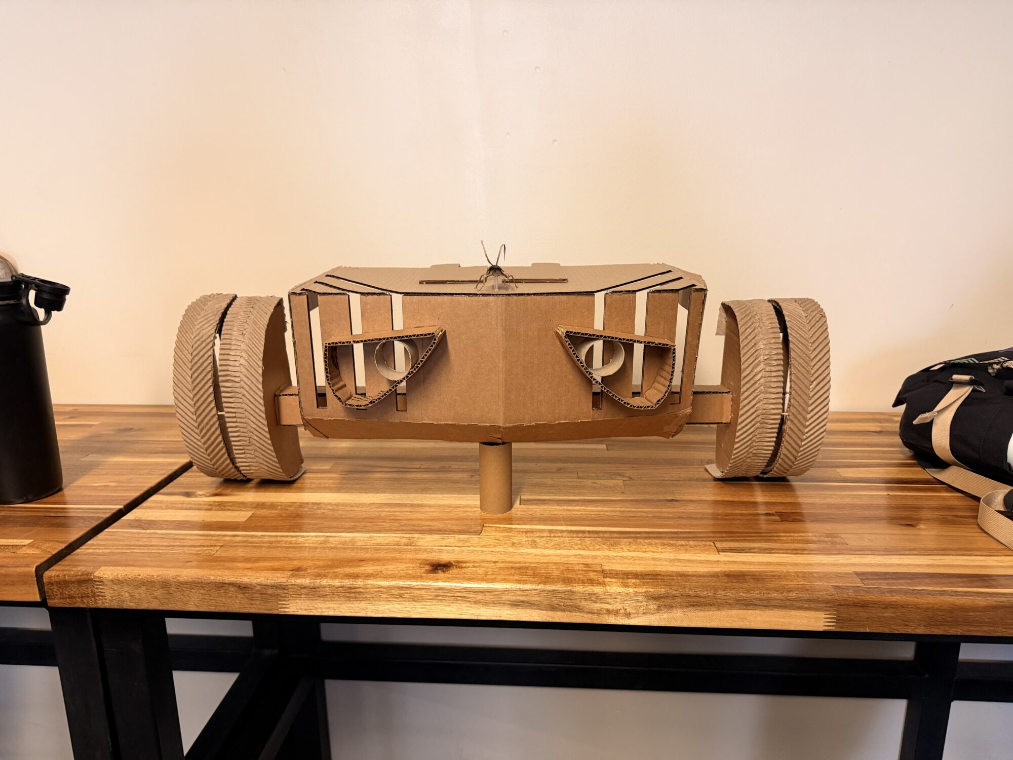 This electric car design was inspired by Wall-E with a mix of Tron. The split wheels allow for light to come through similar to Tron and the headlights and roach ornament are Wall-E-esque