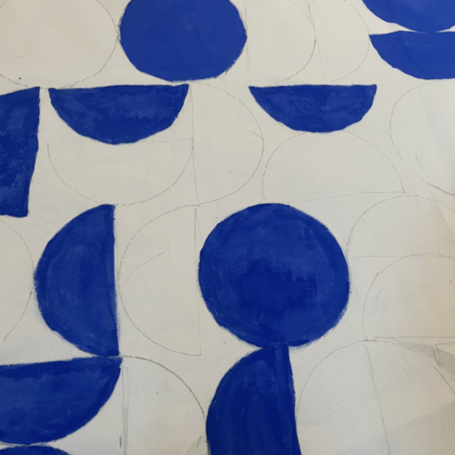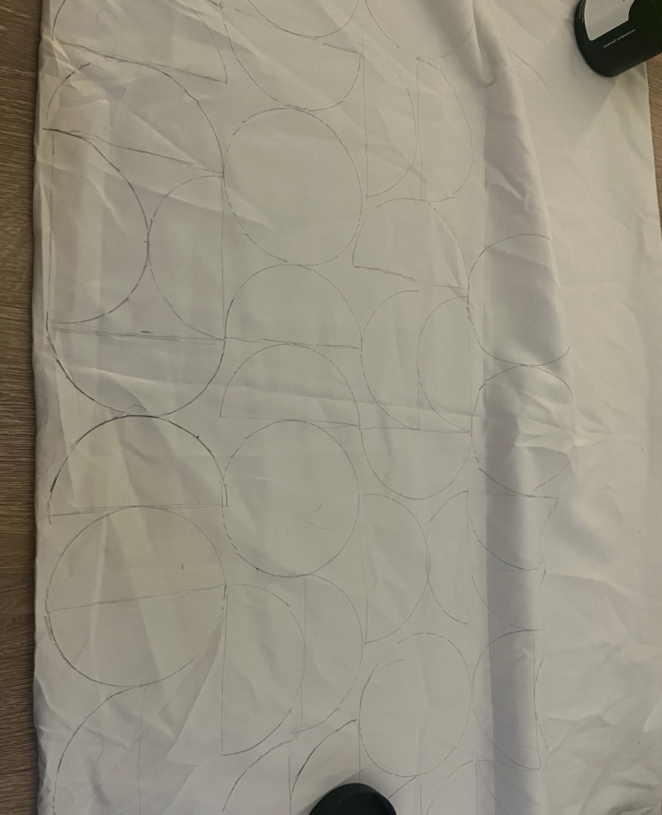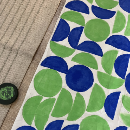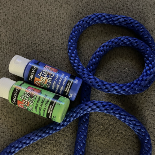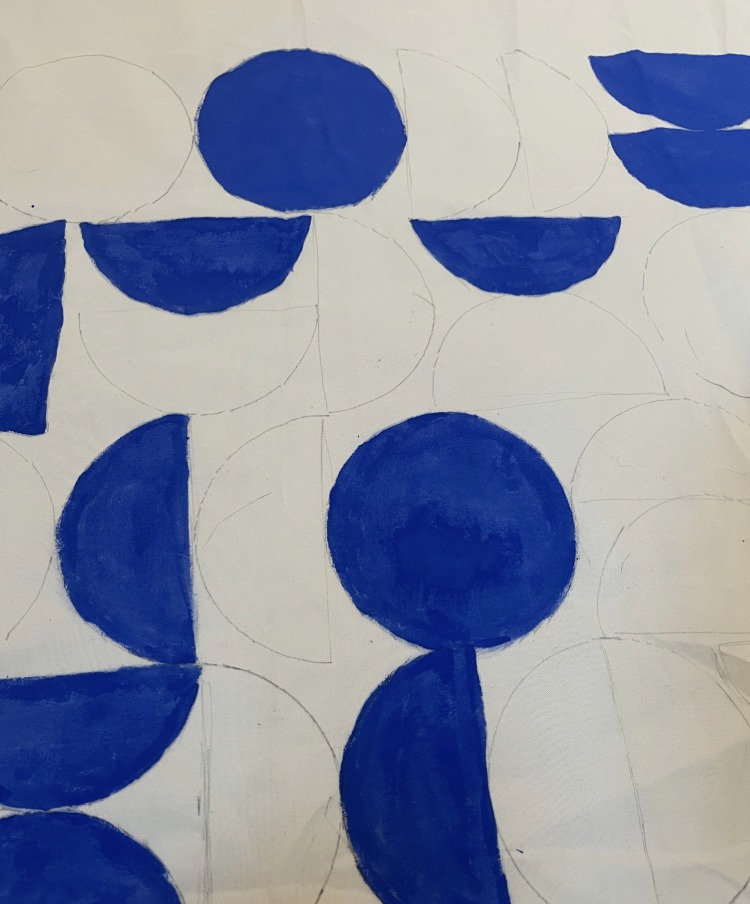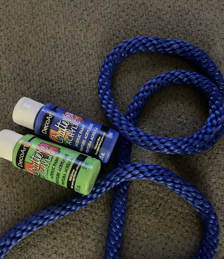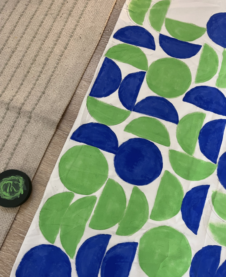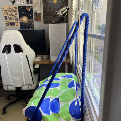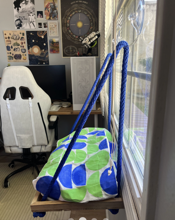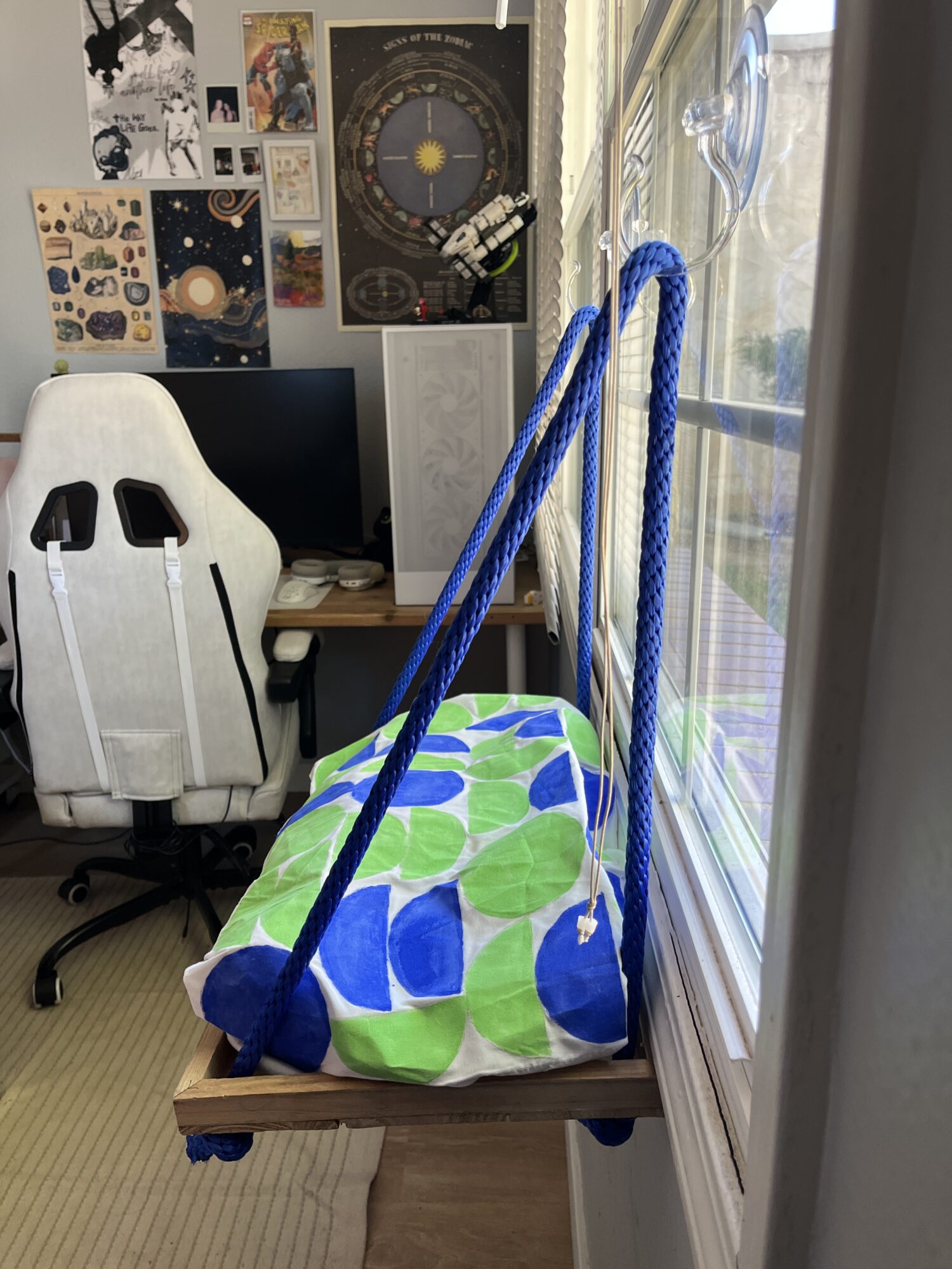 The cushion came from an old bedsheet, hand-painted with Bauhaus-inspired prints referencing geometric designs found online, then sewn and stuffed. Painting fabric turned out to be the most time-consuming part of the process. A bright blue and complementary green carry the color story throughout, matched across the rope, paint, and fabric. The materials were a mix of thrifted, sourced, and repurposed, keeping the project grounded while the design stayed sharp.