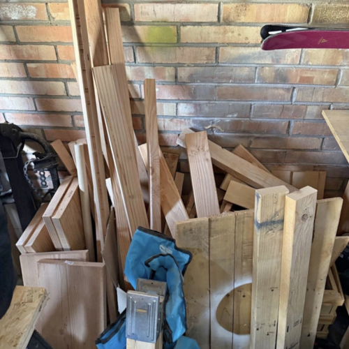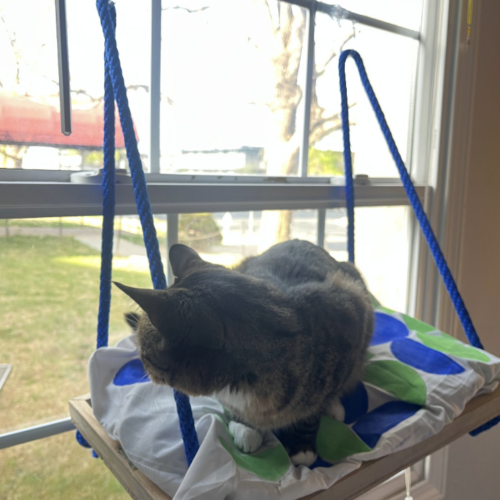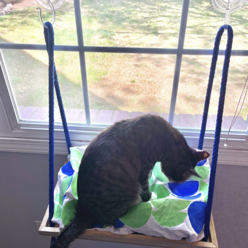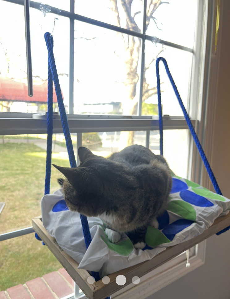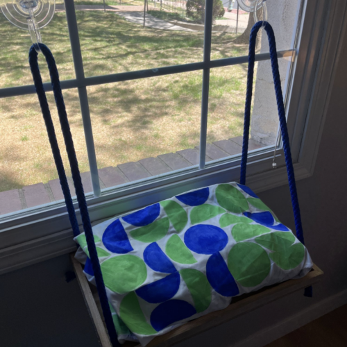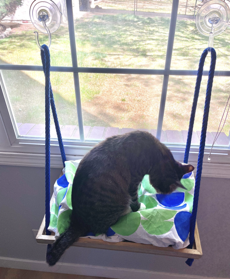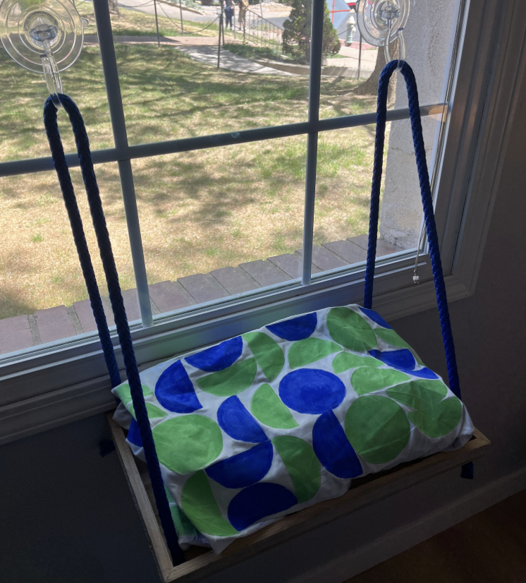 The base is a flat sheet of wood framed by longer pieces to create structure, originally planned to mount to the window with rope and suction cups. When the suction cups couldn’t hold the cat’s weight, the board was secured directly to the wall instead. A practical problem, a practical fix.