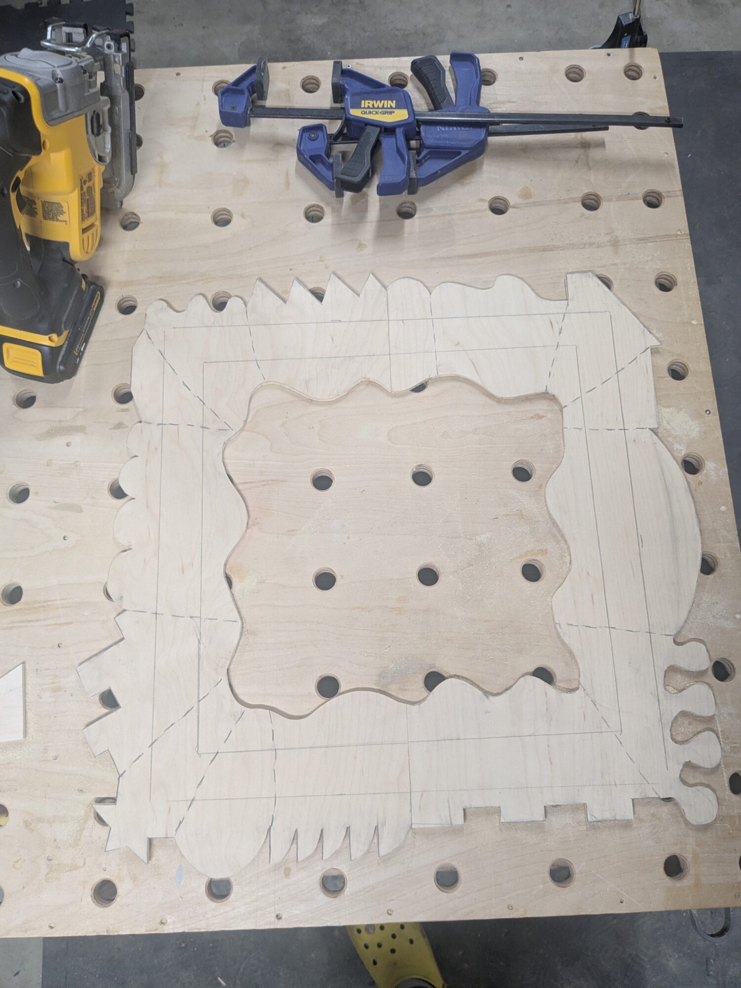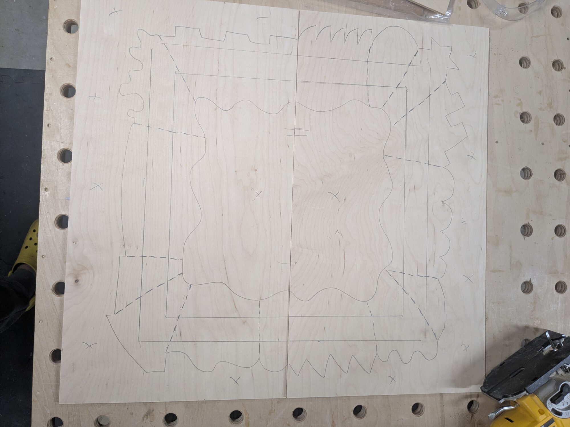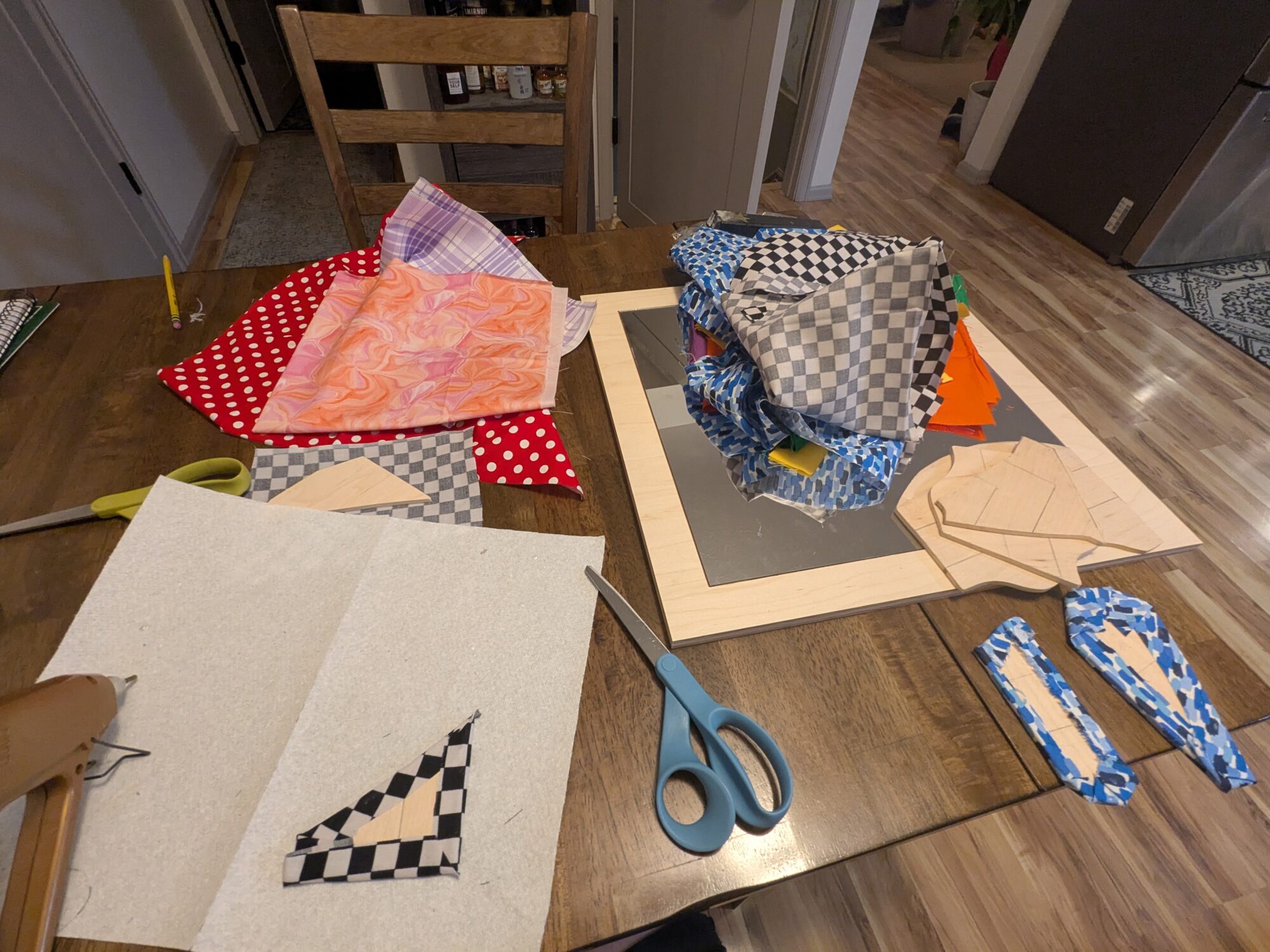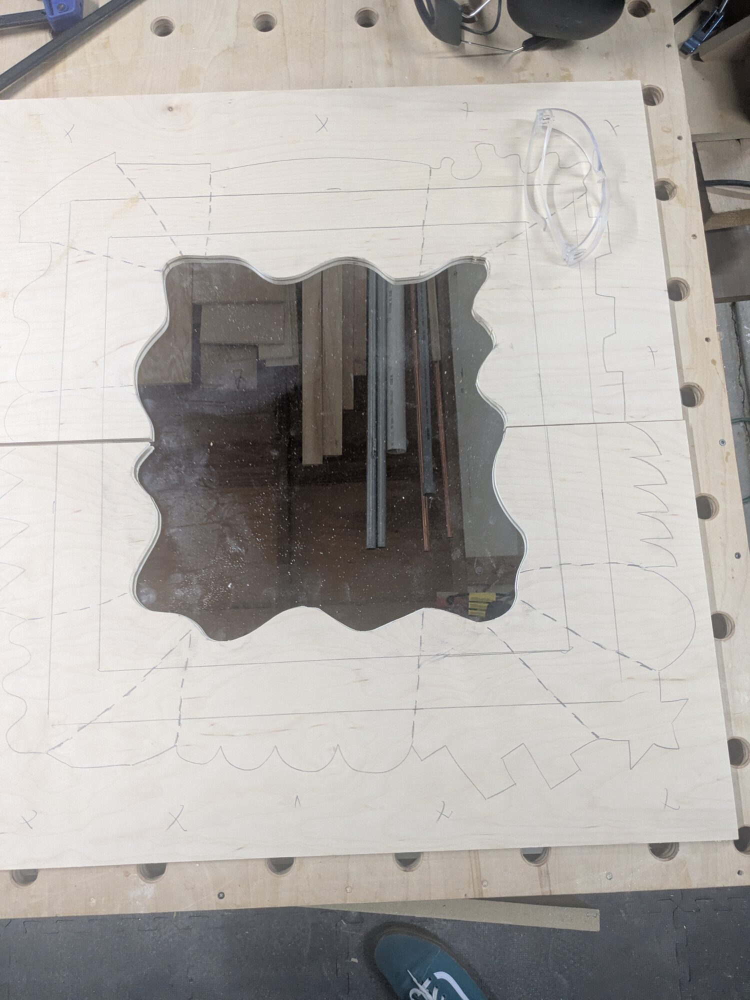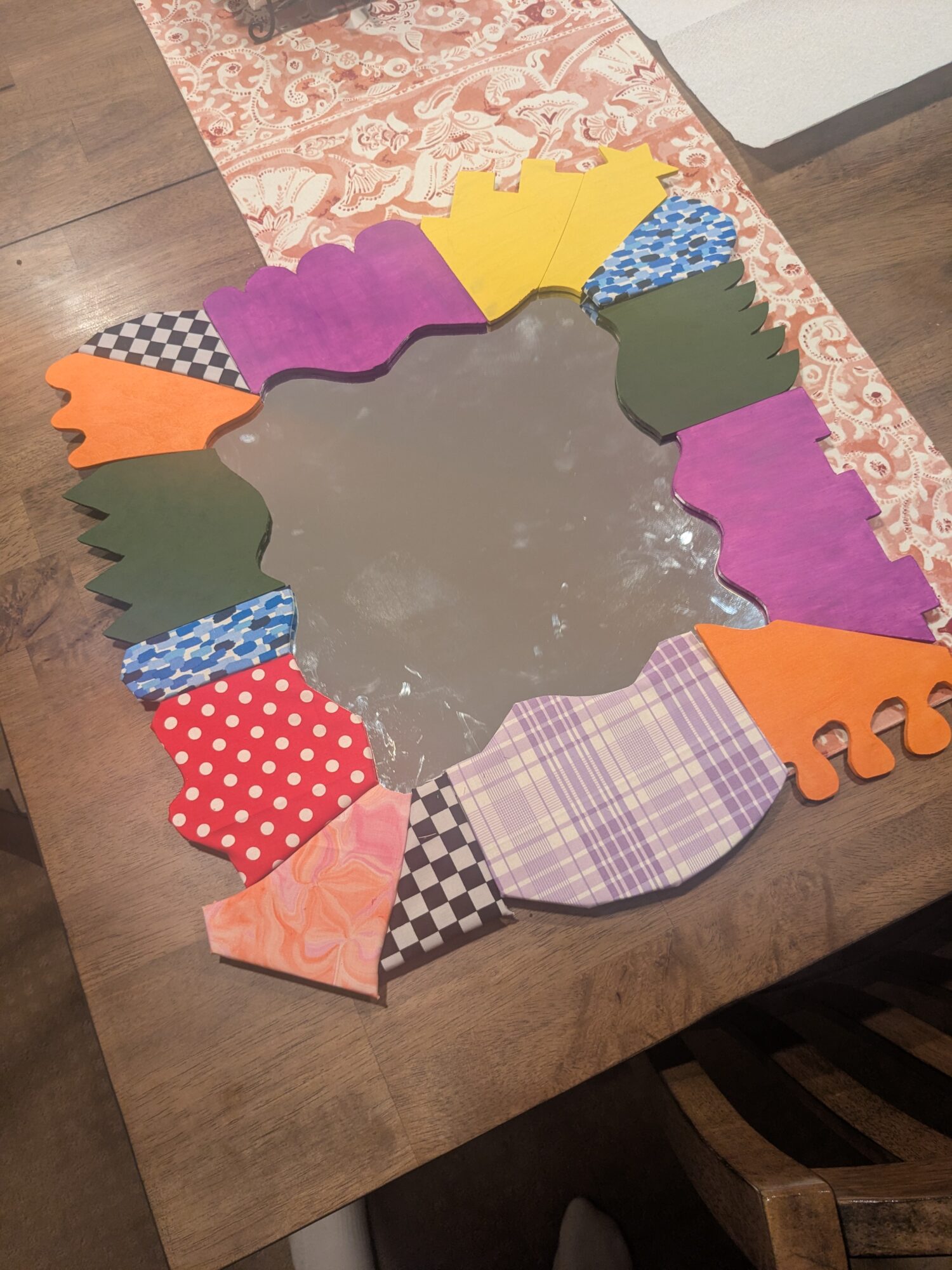 Final Update: 100%. I am finished with the memphis milano mirror frame! It took me a lot of work to complete, but I am very satisfied with the result. I initially started out with two sheets of plywood that I drew on since my previous idea of a cnc machine doing some of the work didn’t pan out. I then cut out the middle hole with a hand saw (cut the frame in half to make it easier), followed by cutting out the outside, and then cutting a bunch of different pieces that I was planning to wrap in fabric later on. While I was doing that, I did use a cnc machine to cut out a small divit from the larger plywood which I used to lay the mirror into. Then, I wrapped some of the pieces but found out that I also wanted to paint some for a second texture, so I painted about half of the pieces instead of wrapping them. After I decorated the wood pieces, I did a “dry setup” where I placed them in a general position so I could pick up the pieces and hot glue them without messing up the positions. Finally, I hot glued the middle for a “caulking” effect and also glued the back for more support. Overall, I am super excited to show it off tomorrow!