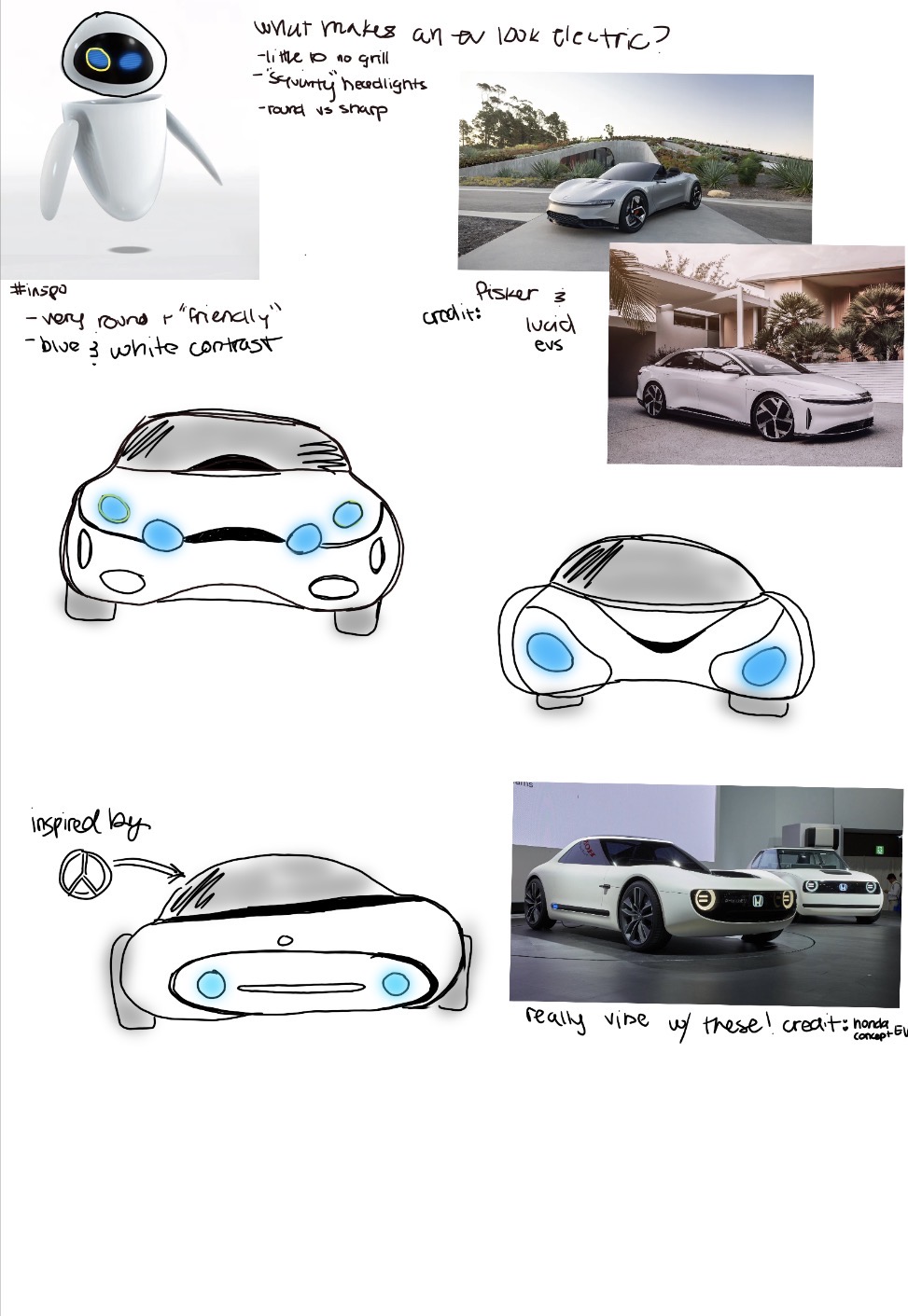 The group quickly narrowed in on a smooth, minimal, no grill design. The reference point we kept coming back to was EVE from WALL-E which helped guide the almost organic silhouette that reads as futuristic and minimalist. Electric cars don’t have grills because they don’t need them, and we wanted the design to actually reflect that rather than just slap a traditional car shape onto cardboard.