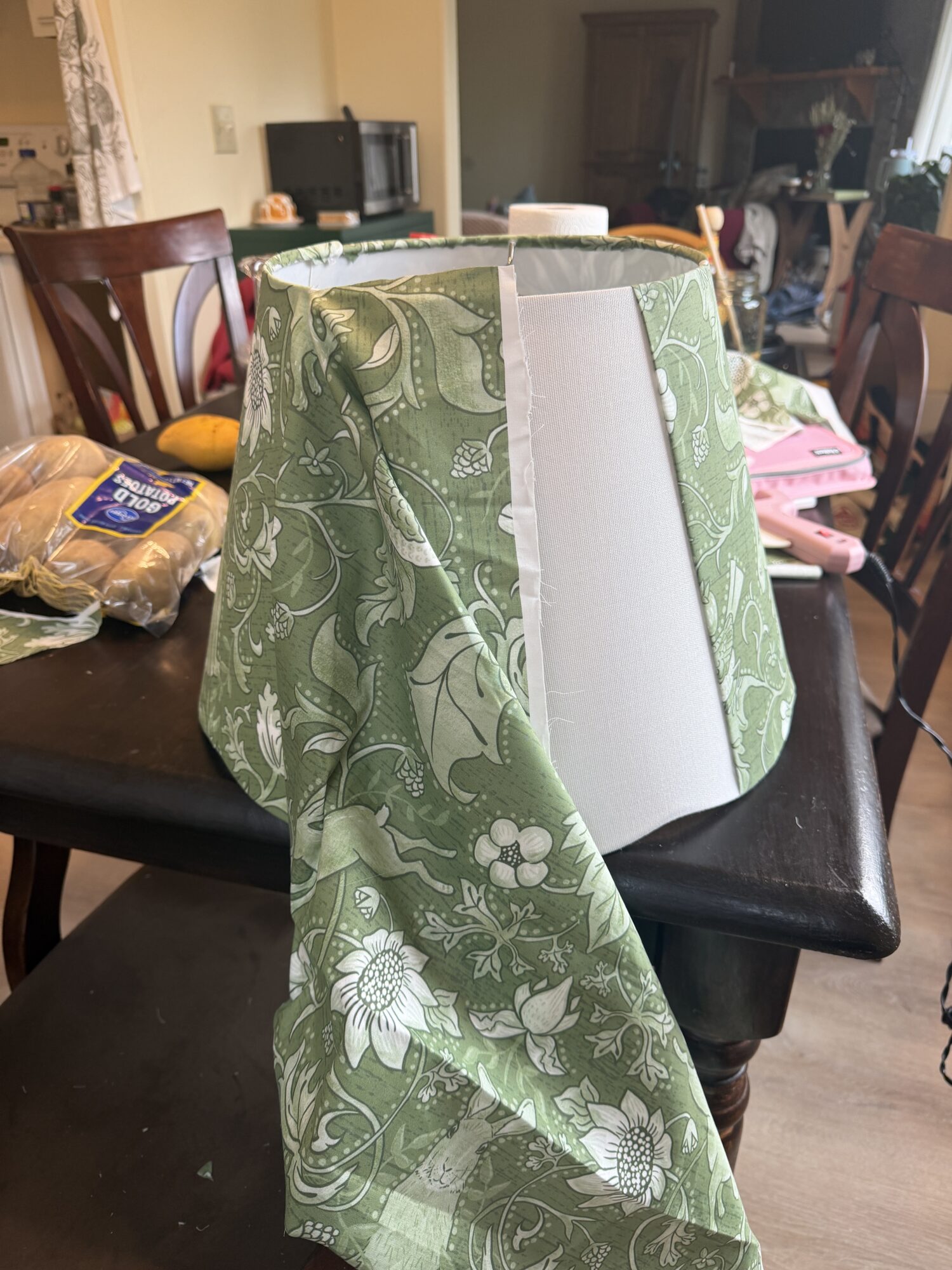 The build had some fun problem solving moments. The bulb is held up by a 3D printed bracket hidden inside the base. I 3D printed a knob too, but straight off the printer it looked too clean and minimal, completely wrong for the aesthetic. So I wrapped it in yarn and added dowels to make it look like knitting needles mid-project. That ended up being one of my favorite details. I also added lace trim and a bow to the shade, and a red yarn ball at the top.