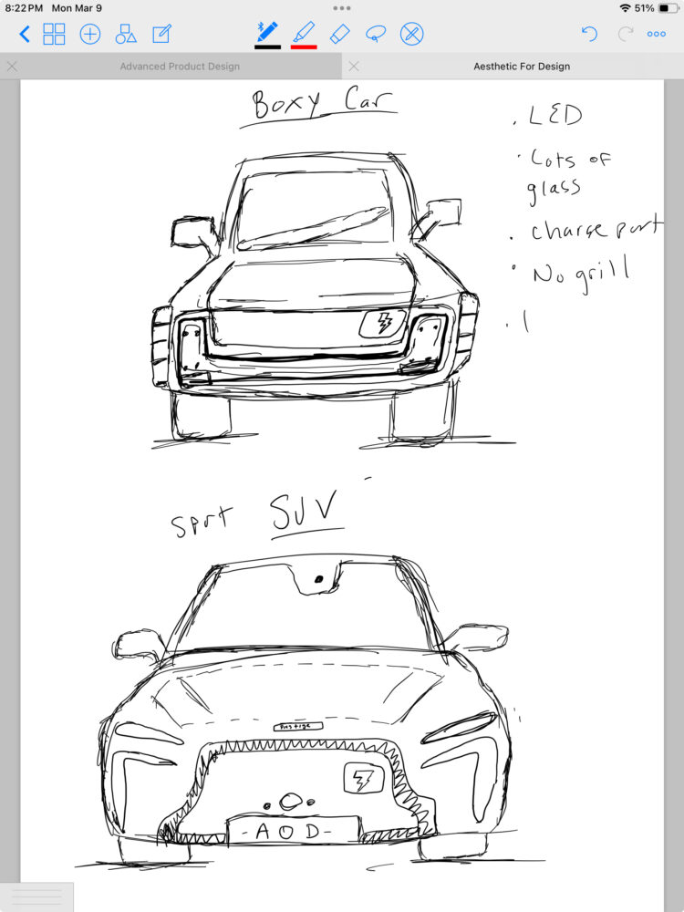 This was the 2nd project in AOD, where we had to discern what elements of a car design help us instantly determine if the car is gas powered or electric. We were tasked with taking those elements, CADing up a design and then producing that design into a cardboard model. No paint, no glamor, just raw design.
