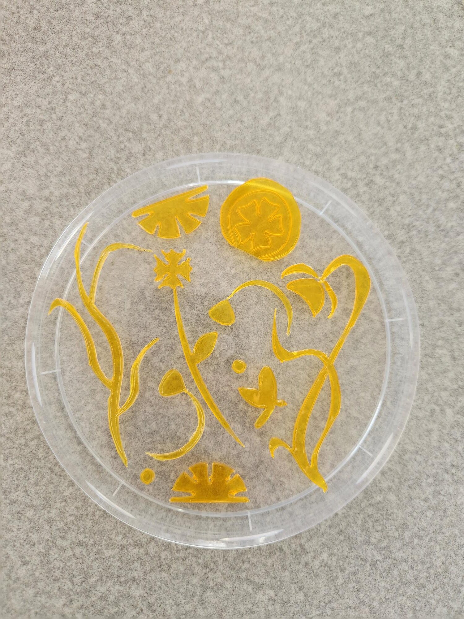 For this upcycling project, I made an Art Nouveau suncatcher out of old pill bottles. I used a heat gun to get the labels off without leaving a sticky residue, and then used a hot knife to cut off the top and bottom of the bottle, and slice through the middle so I could open it up and lay it flat. I then used the heat gun to heat up the plastic to be able to lay it flat. I designed some Art Nouveau-esque flowers and motifs in Adobe Illustrator, and used the laser cutter in the Idea Forge to cut the designs out of the pill bottle strips. Lastly, I had some clear Elmer’s glue that I poured into a yogurt lid (to act as a mold) and added my laser-cut flowers and motifs! This project turned out better than I thought it would, so I was pleased with the results!