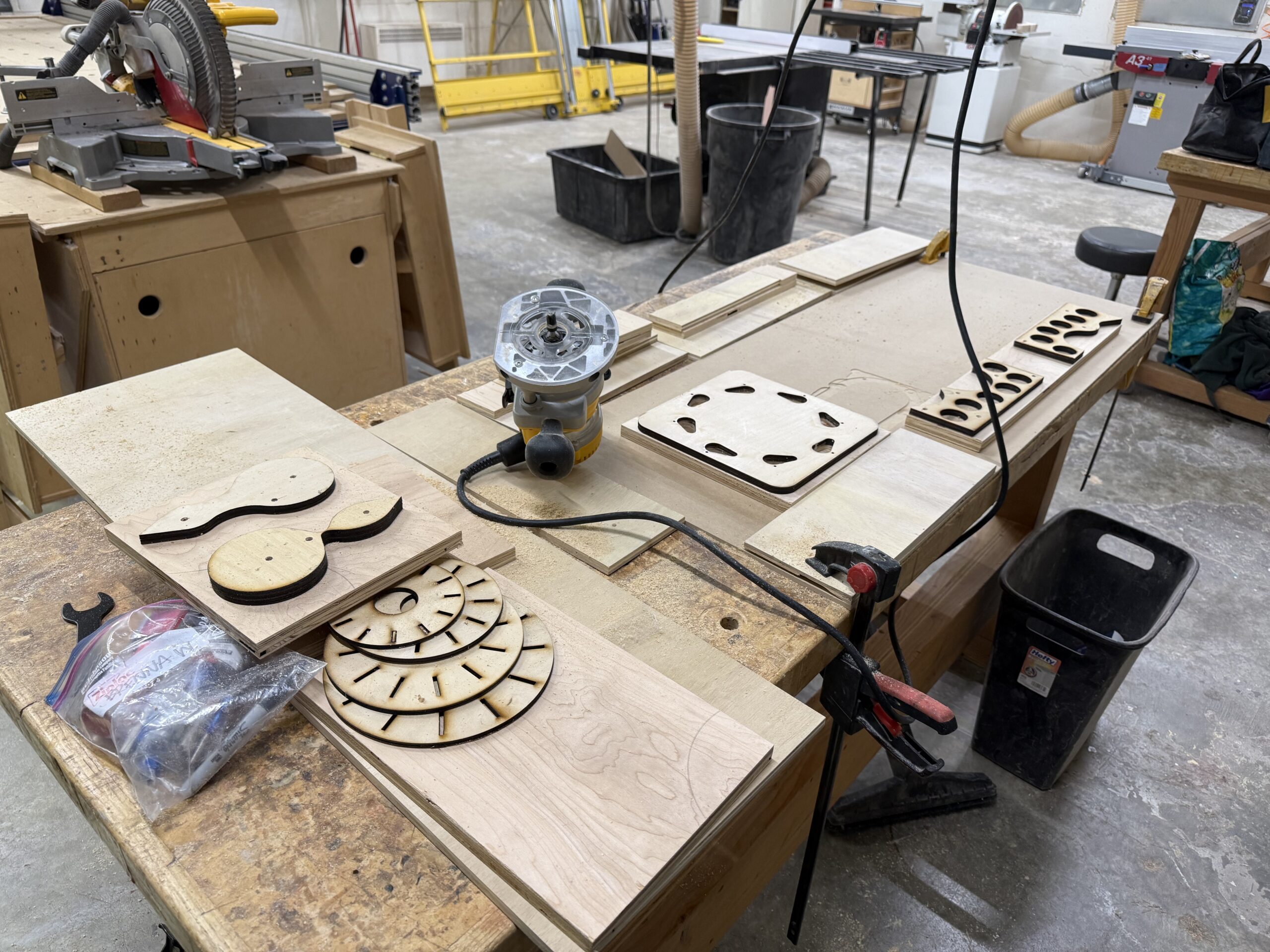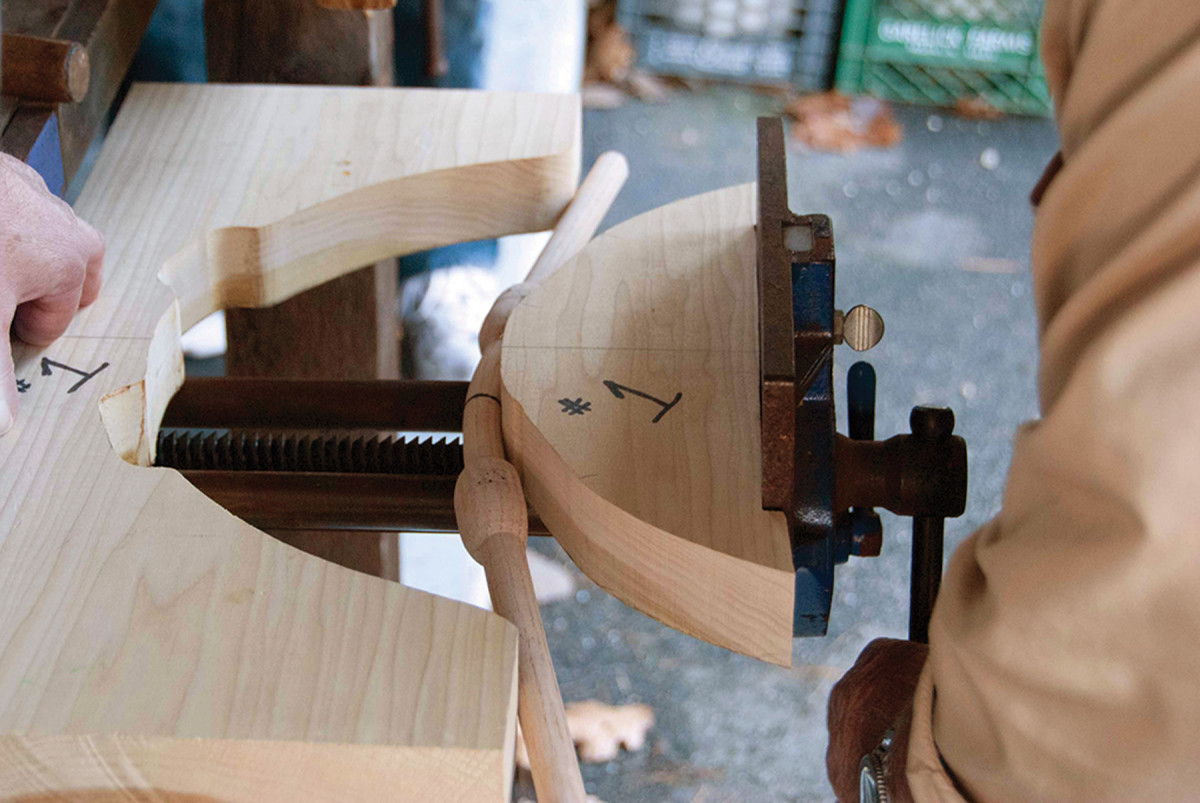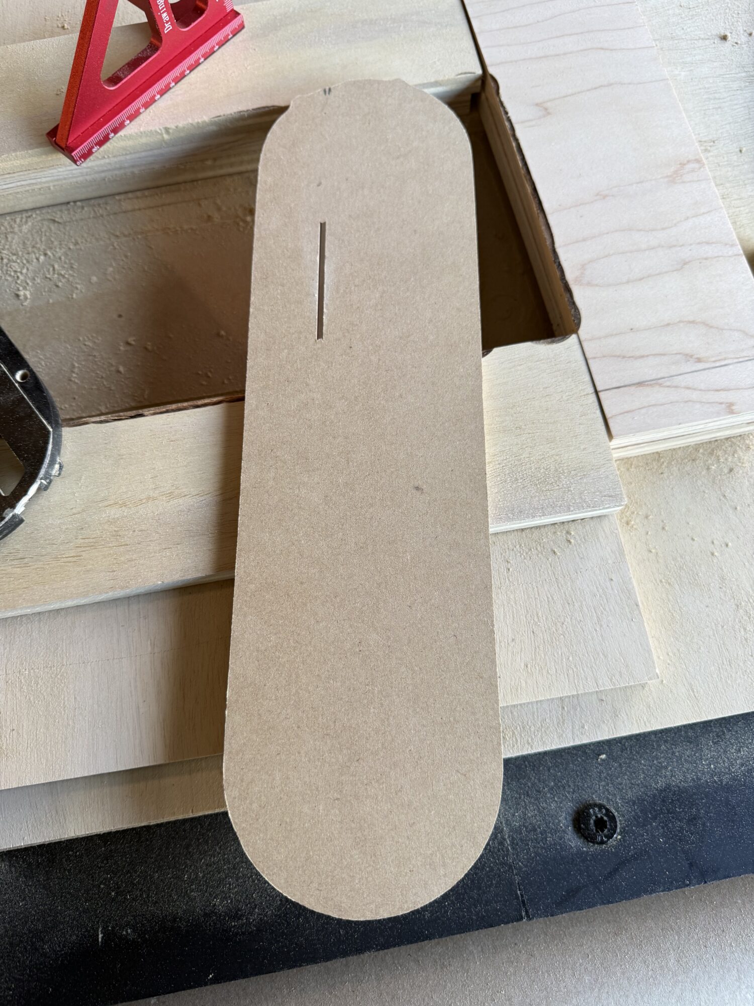 I cut a piece off the end of a board I had and cut it again, vertically, on a band saw. I ran them through a drum sander until they were the same height and glued them together. I taped the laser-cut template to the glued-up piece and rough-cut the edges around it. Afterward, I used the table router with a flush bit to get the final shape, then a corner-rounding bit for that nice finished curve.