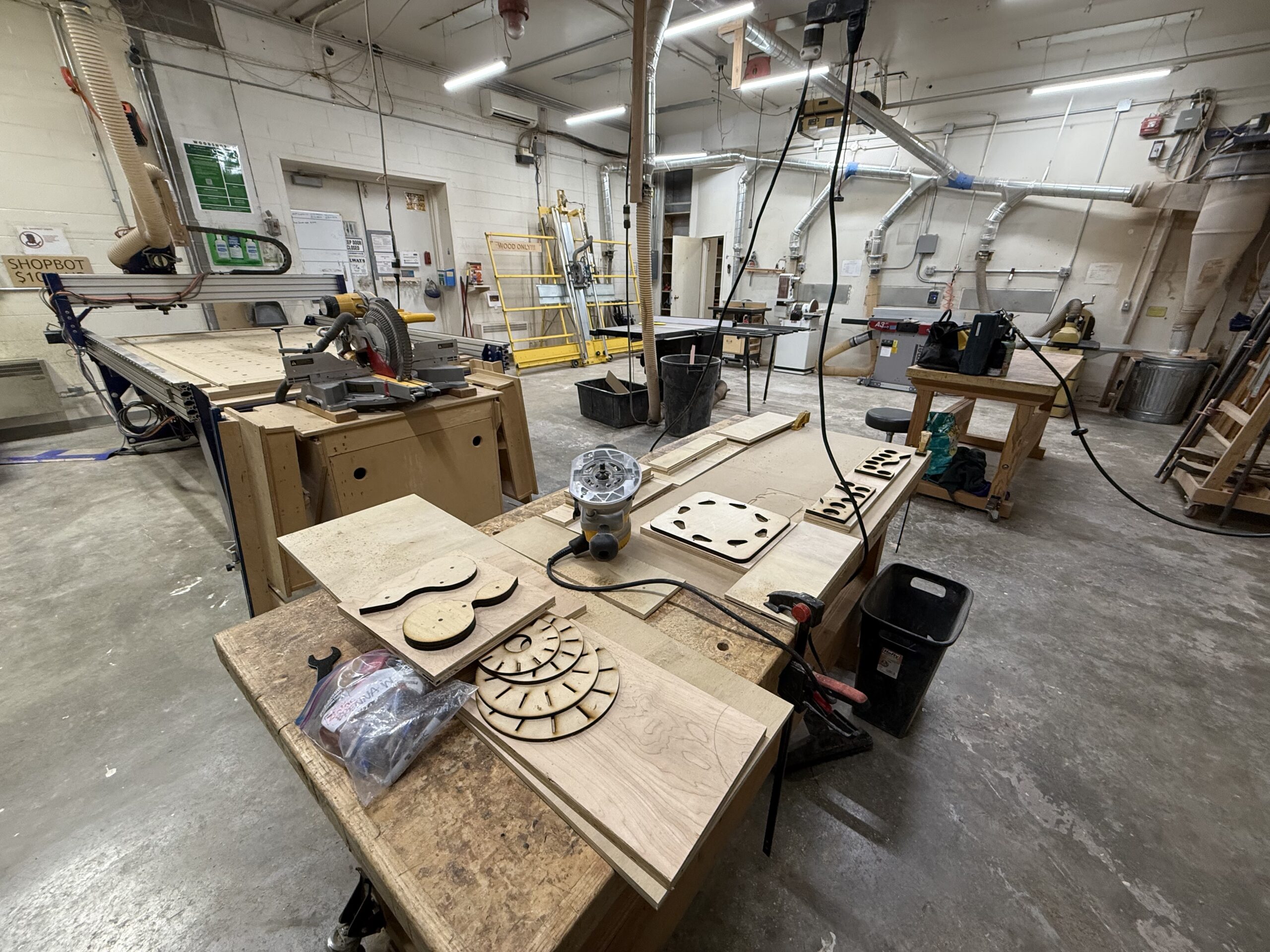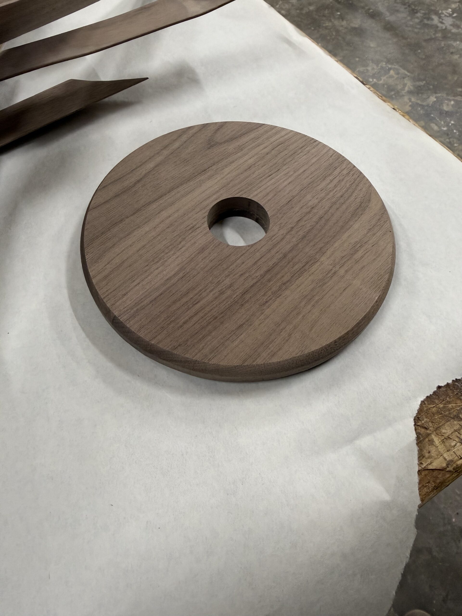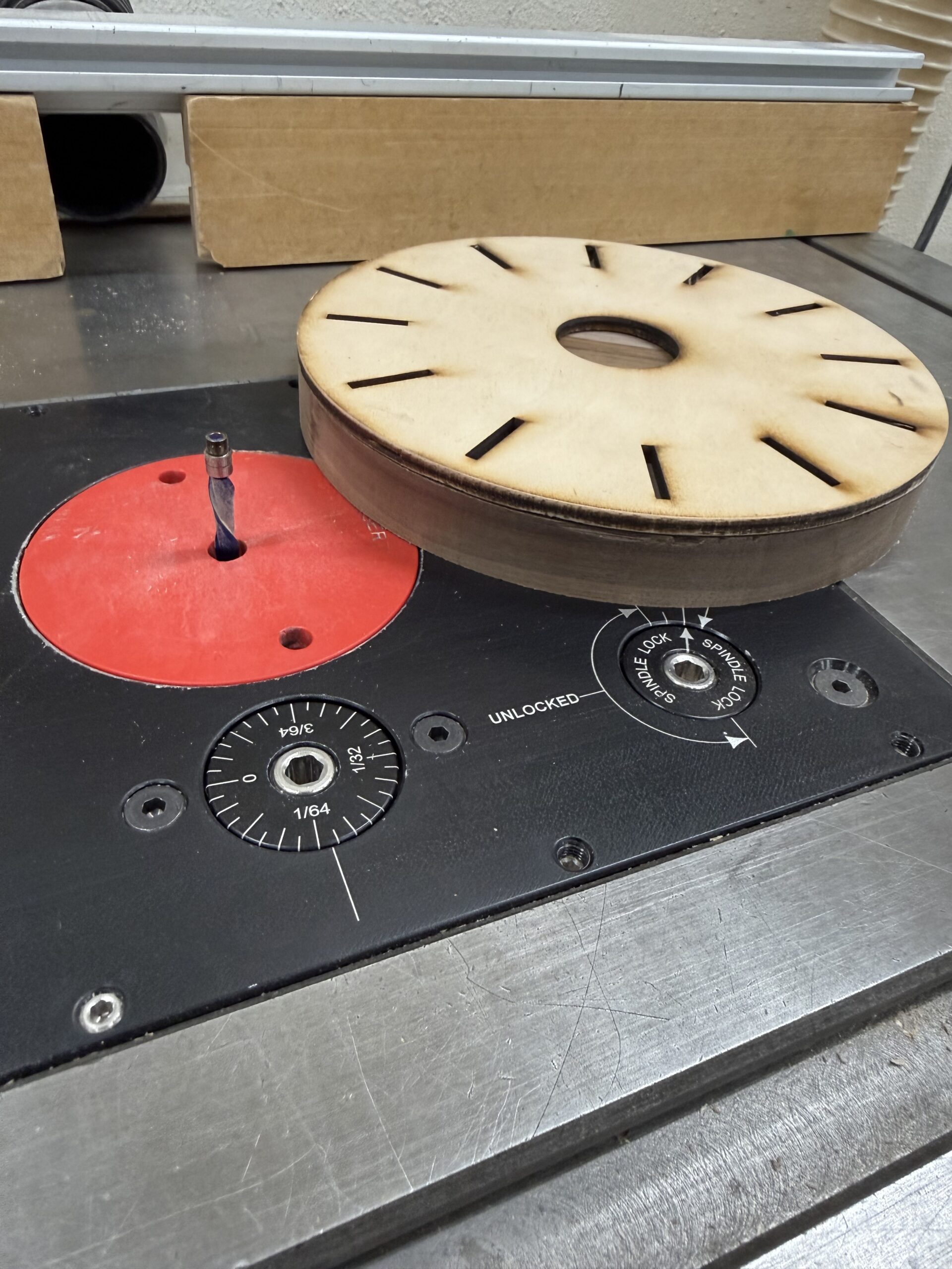 I cut a piece off the end of a board I had and cut it again, vertically, on a band saw. I ran them through a drum sander until they were the same height and glued them together. I taped the laser-cut template to the glued-up piece and rough-cut the edges around it. Afterward, I used the table router with a flush bit to get the final shape, then a corner-rounding bit for that nice finished curve.