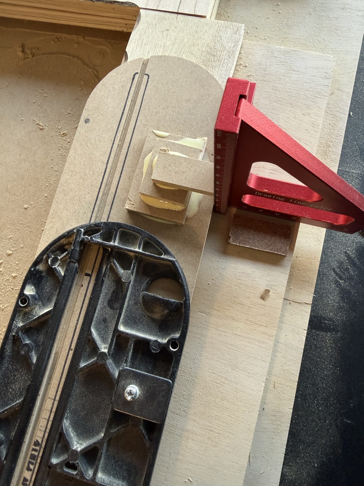 I used 1/4″ MDF and taped the throat plate that my table saw came with to a rough cut square that was slightly bigger than the plate. I cut the plate with a hand router, using the throat plate as a template. This was a good and bad idea, because there are a few spots where the plate is lower. At these spots, the router bit nicked the plate.