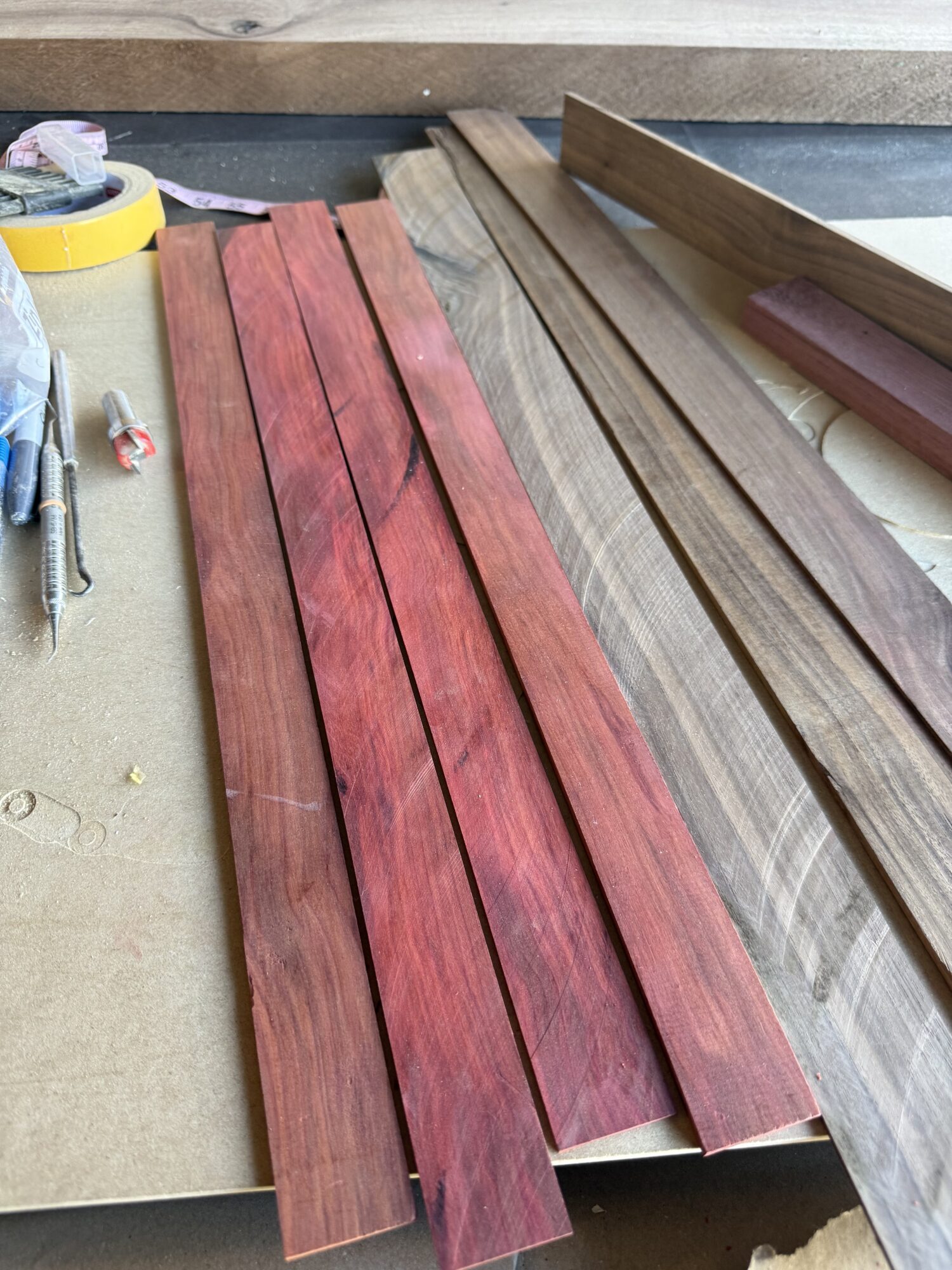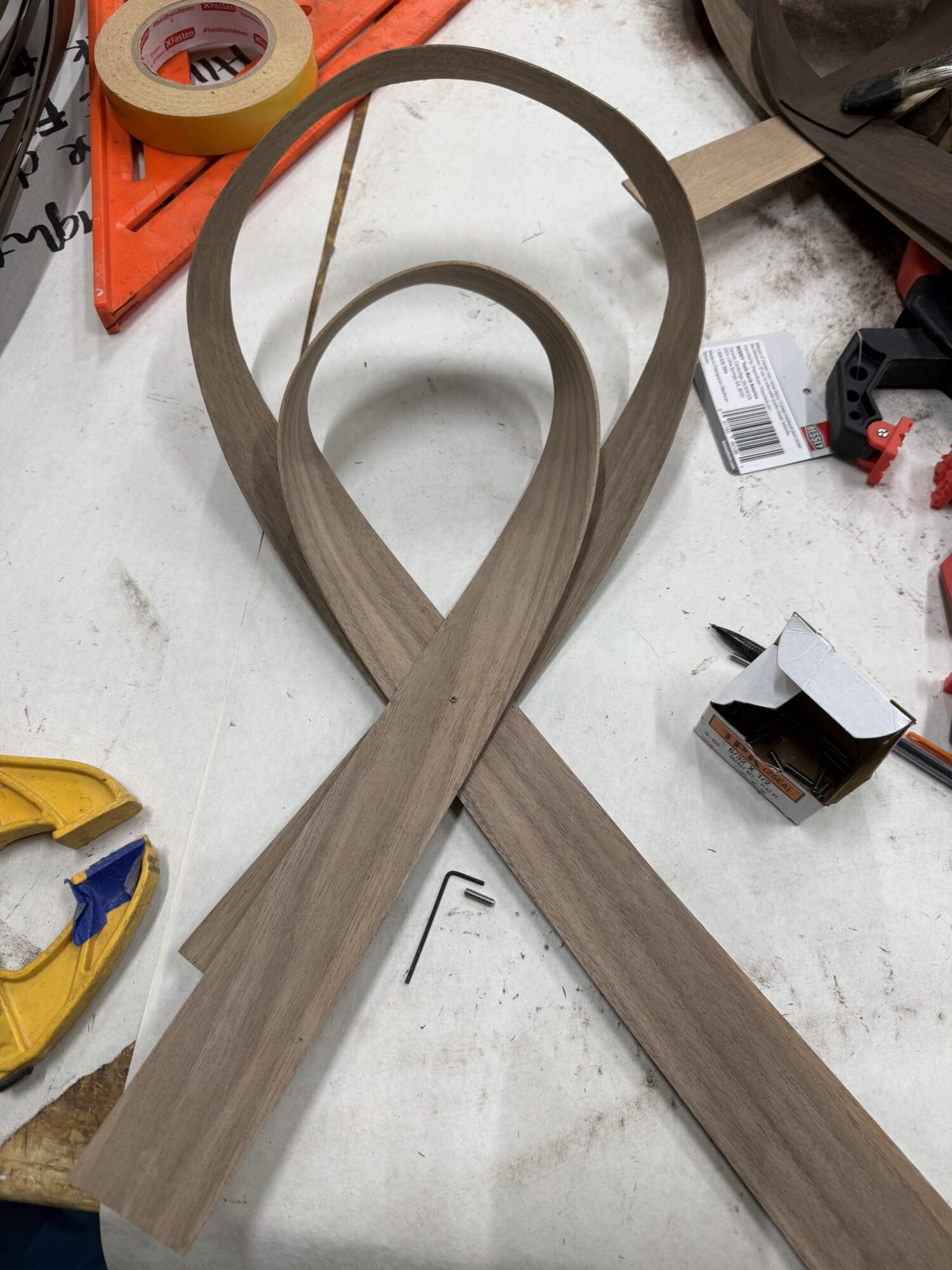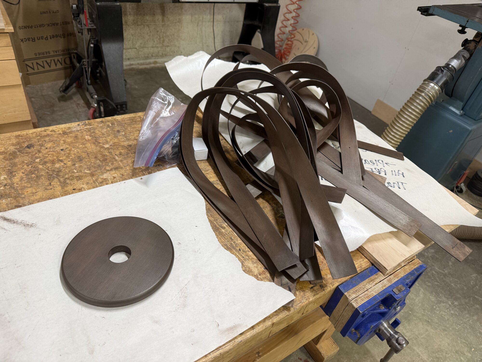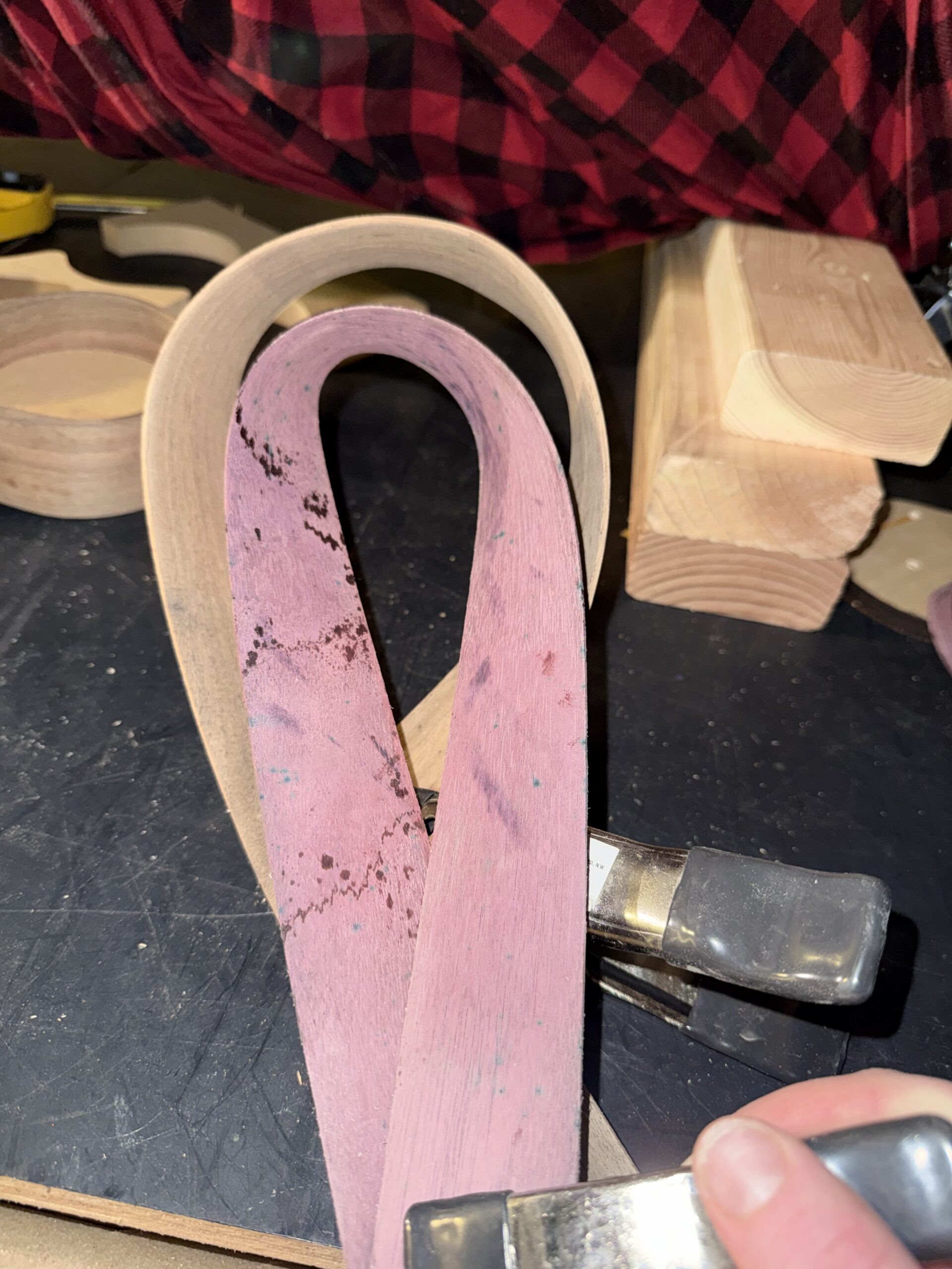 The purpleheart wood developed odd blue discolorations after steaming, and the soak wasn’t enough to overcome the effects of kiln-drying. In the end, I went with walnut.
