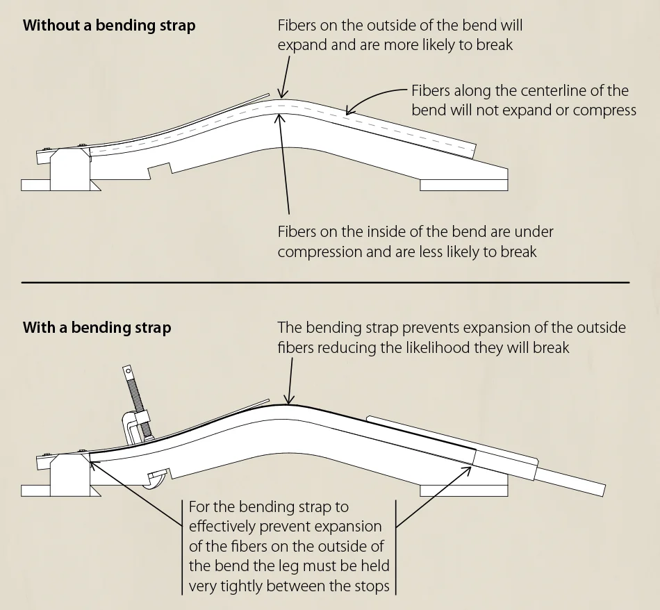 Wood does exceptionally well under compression, but it doesn’t like to be under tension. This is why you usually need a strap around the outside of it–placing a metal strap on the outside of the bend takes on that tensile load and allows the wood to go back to being fully under compression.