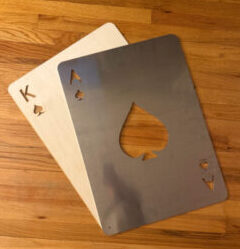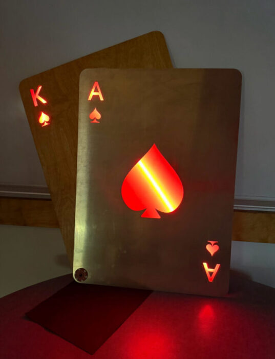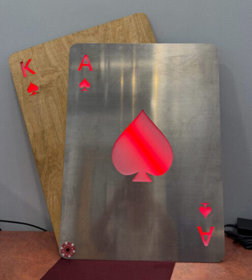 I made a poker inspired wall decoration, the idea was two create two larger cards, a king and ace of spades made of different materials. I laser cut the cards from an aluminum plate and wood sheet. I added tinted plastic behind the letters and symbols so that LED strips on the back can shine through. I also added a colored finish to the wood to make it look more polished. The electronics consisting of a red LED strip, LIPO battery and power switch are held in a 3D printed casing on the back. Felt fabric lined the print and a poker chip was added to enhance the aesthetic. Future work: mount it to a wall and switch the power source to a wall plug.