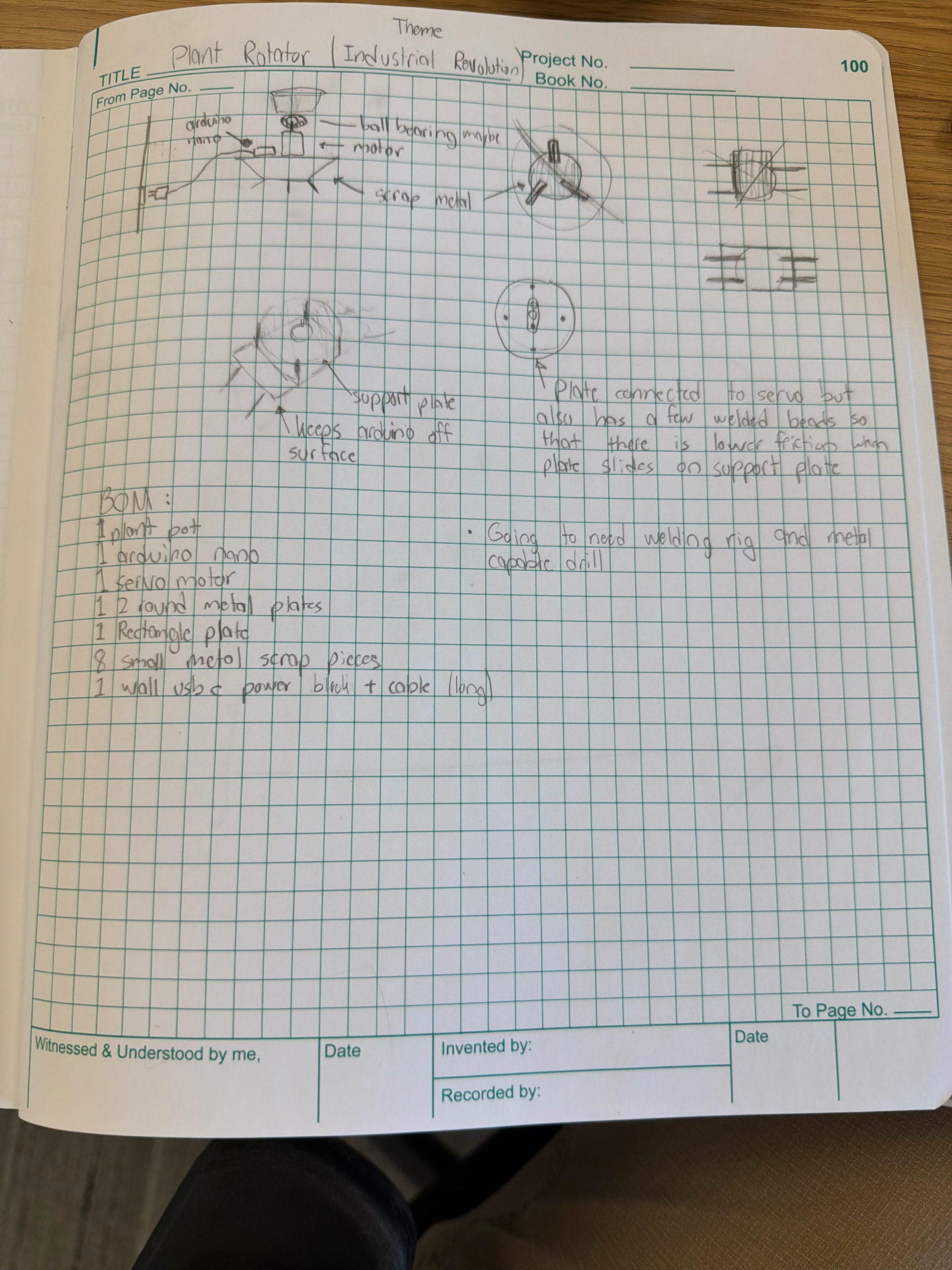My idea was to create a “plant pot rotator” with an Industrial Revolution Functionality aesthetic. I planned on welding scrap sheet metal to create the frame, and then use a motor and arduino to rotate the pot. I’m not sure yet if I’m powering the system via a wall port or a battery. I was able to get some of the electronics from the idea forge and some scrap steel from the ITLL machine shop. But I’m I need a little more steel so hopefully eco cycle has some. Also made a simple cardboard prototype of the frame.