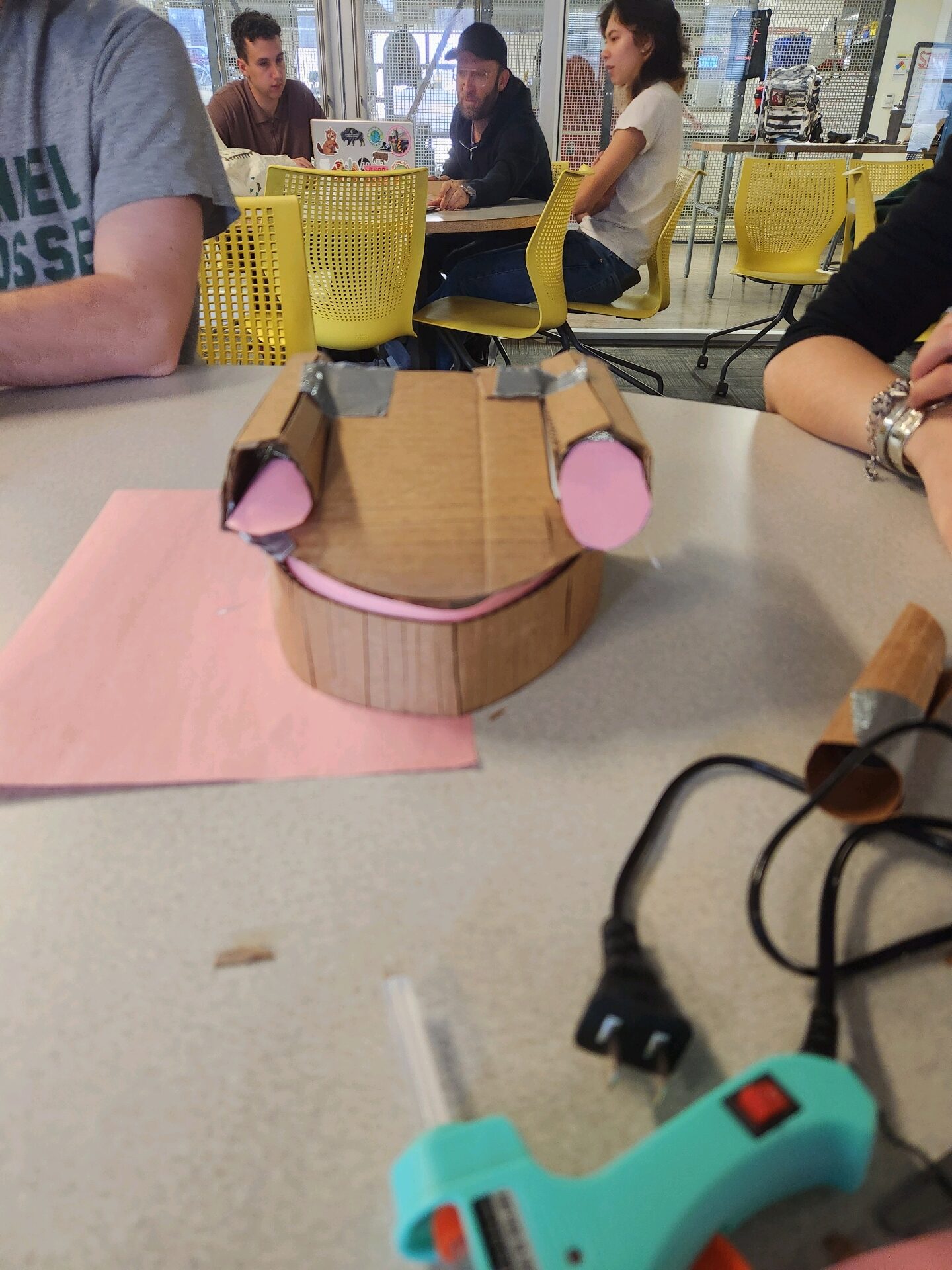 This is our cardboard model of an electric vehicle. For this design we really want to capture the essence of sporty or luxury cars that have a sleek look to give that feeling of fast. We also want to clearly advertise the electric aspect by using staples of the electric car aesthetic such as led bar straps and smooth curvature.