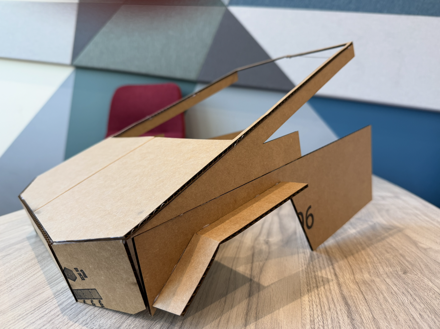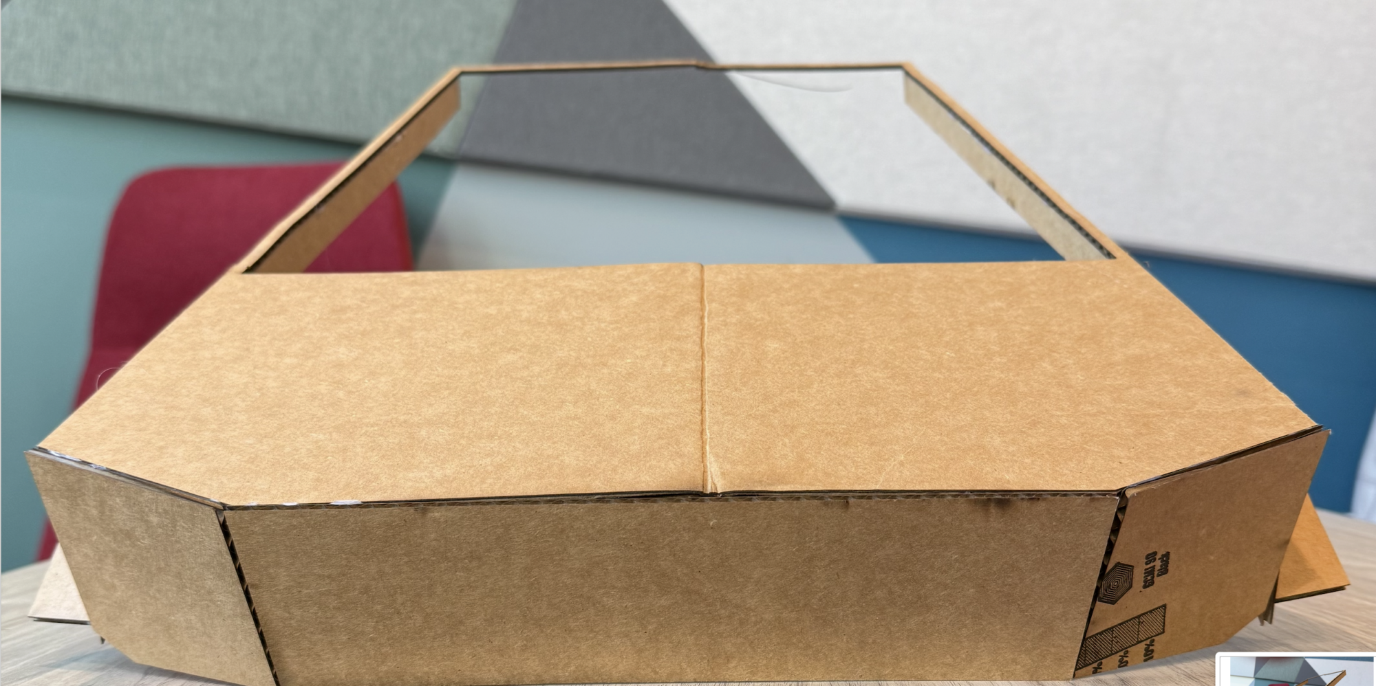 This is our finalized front bumper of the cyber truck. We chose the cyber truck because of all the flat faced geometry that makes it a unique car design. What we didn’t realize is that can also make it look more simplistic. Kevin laser cut all the cardboard for this project before passing it off to Dylan who assembled it all into a finished product.