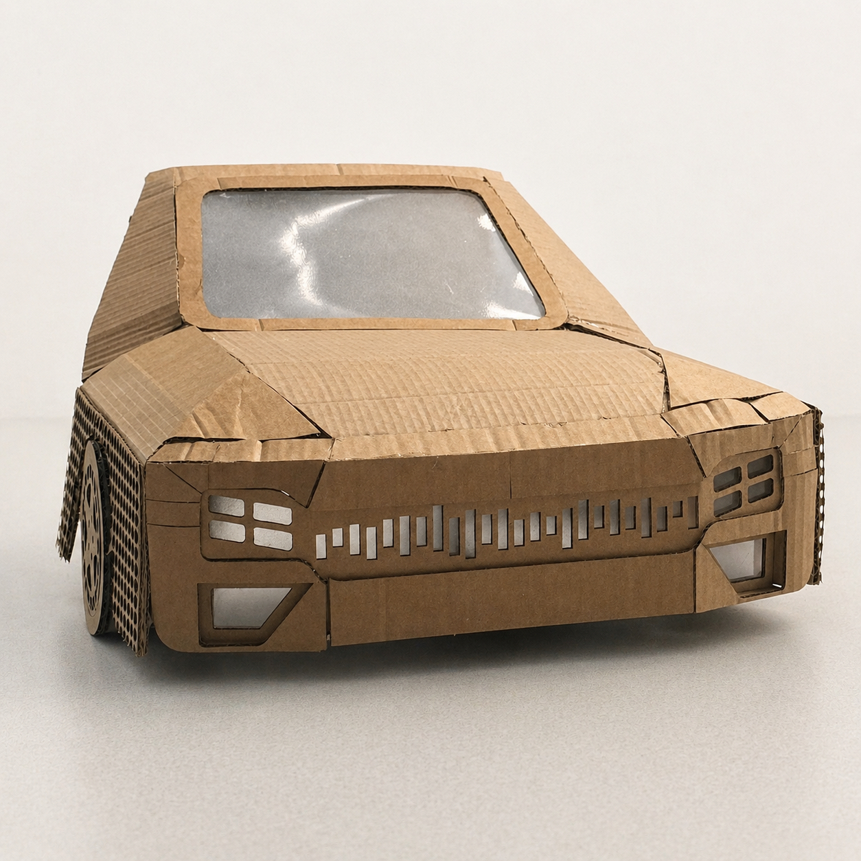 Work progressed through a mix of materials and collaborative effort. Cardboard was used for the main body, while repurposed plastics helped bring in more realistic details for the windshield and lights. The front end depended on a CAD file for laser cutting, so other parts were built in parallel while that was being finalized. The golf ball texture required a lot of time to cut and apply, but added a distinctive finish. Overall, teamwork was strong and everyone contributed across different parts of the build.