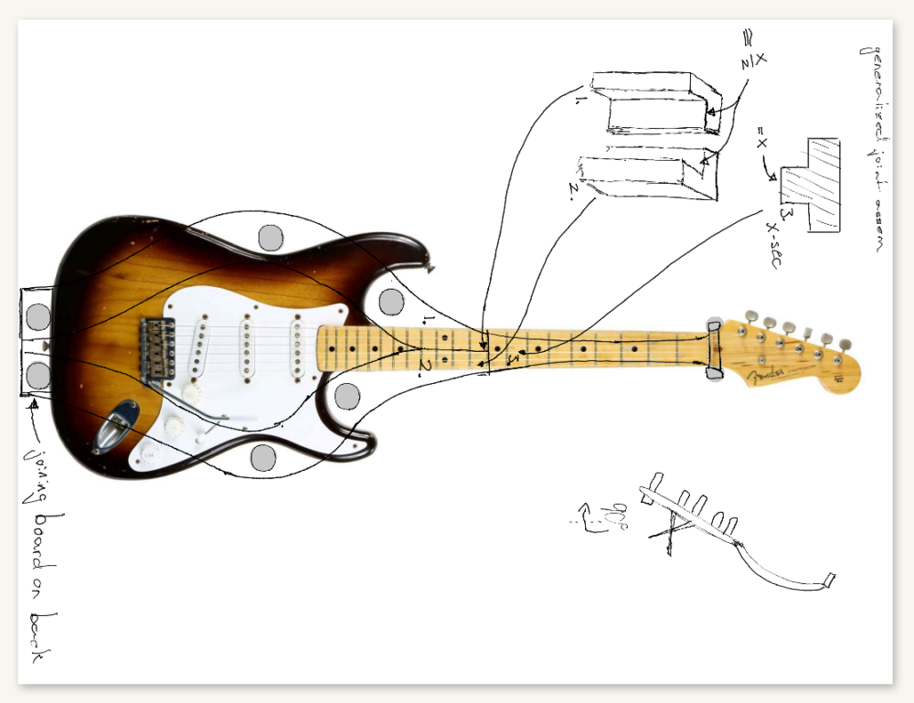 Using those general dimensions I began a sketch of what the stand might look like. I chose to essentially contour opposite the guitar; where the guitar is wide the stand is narrow and where the guitar narrows the stand is wide.
