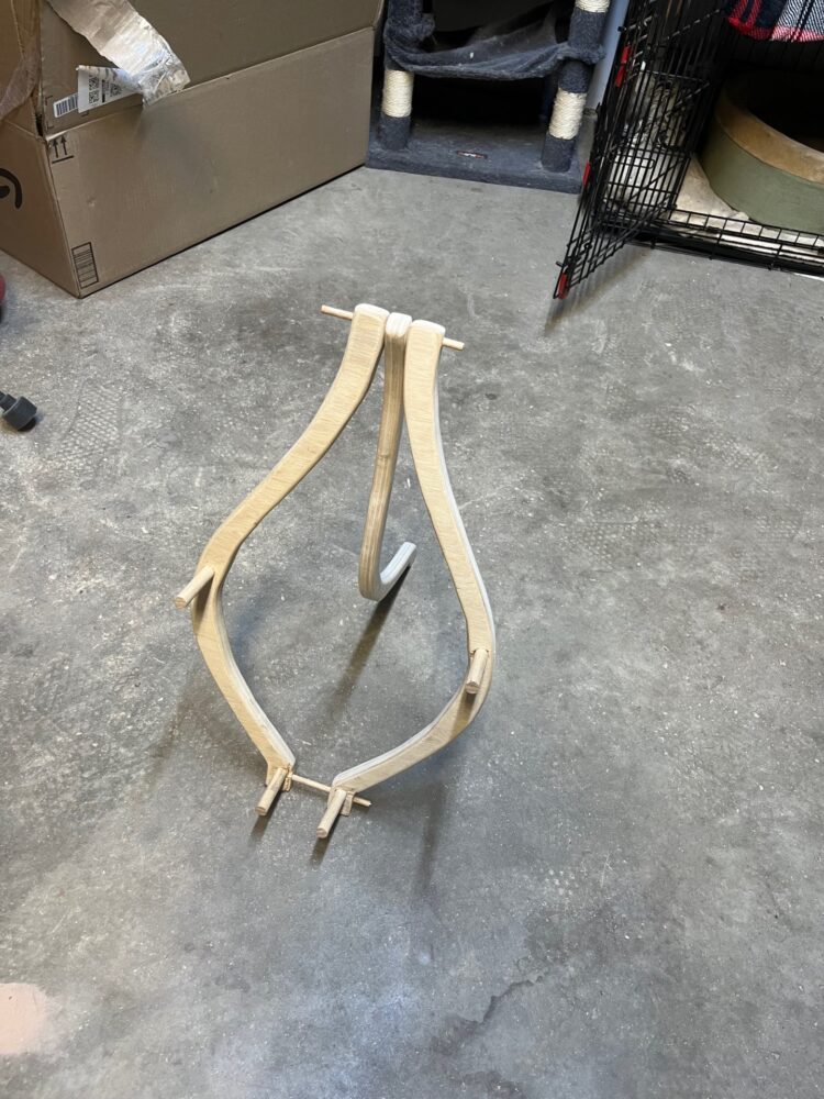 Using my template I was able to cut two identical arms for the stand and was able to add the main holes for the support pegs. Unfortunately, as I began working with the plywood I realized the initial vertical dowel supports that I wanted would not be structurally sound. So I used the template I had made once more and created a third identical arm.
